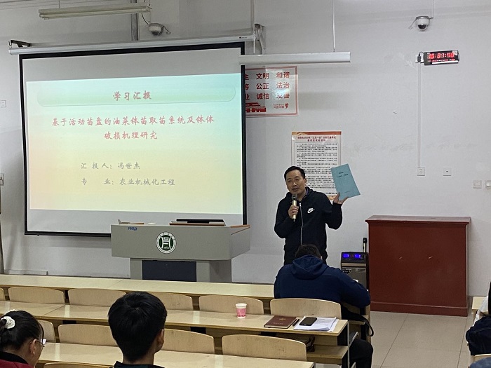 10月13日下午4点半,园艺学院师生在二教304教室举行新学期博雅讲堂第二期,园艺学院博士冯世杰为大家作了“基于活动苗盘的油菜钵苗取苗系统及钵体基质破损机理研究”的研究报告。学院党总支书记张祖成、院长龚守富、部分教师和学生参与了这次讲堂。