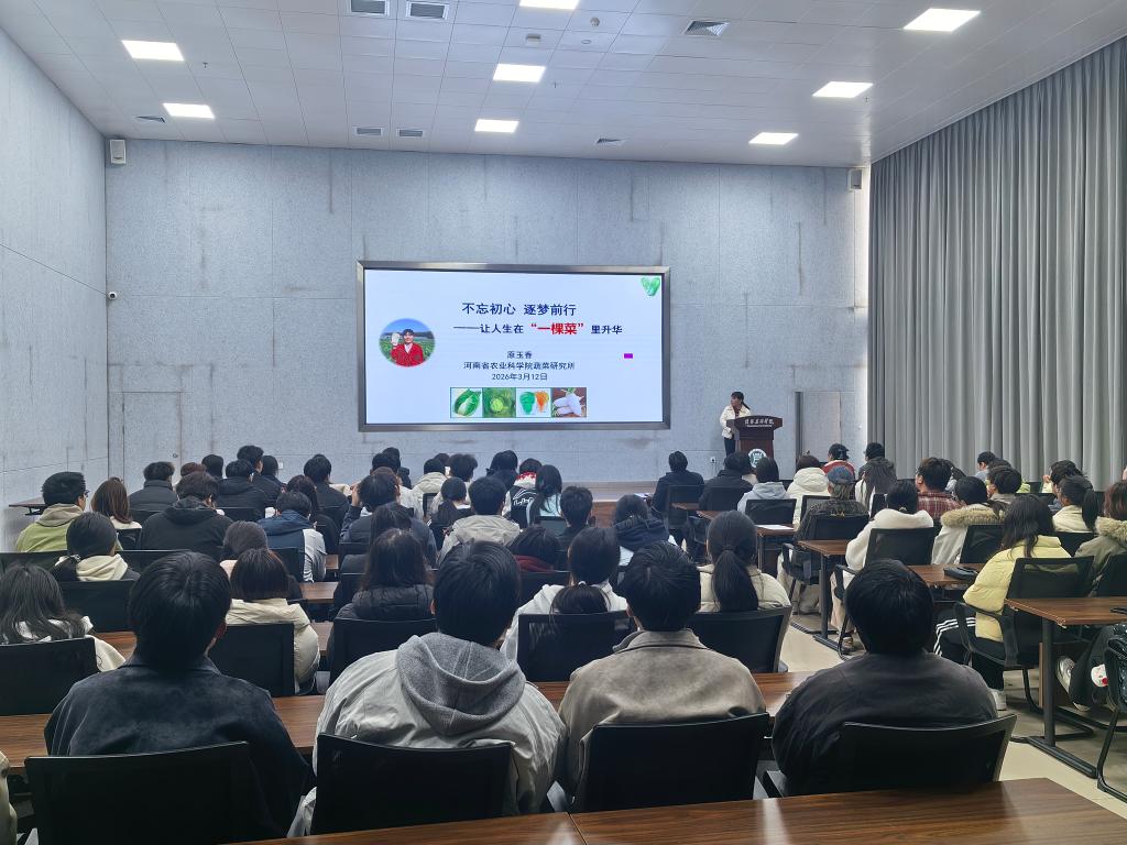 为进一步活跃学术氛围,激发师生的科研热情与“三农”情怀,2026年3月12日下午,园艺学院特邀河南省农科院蔬菜研究所原玉香二级研究员在学校双创中心一楼报告厅为学院100余名师生作了题为“不忘初心逐梦前行——让人生在“一棵菜”里升华”的学术报告会。报告会由园艺学院院长龚守富主持。