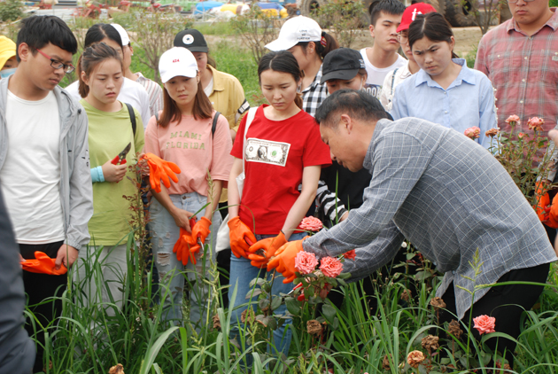 胡场长向学生讲解月季、玫瑰等修剪技术要领,认真示范,同学们认真听讲、观摩,并积极投入到月季修剪教学实习中。学生们还参观了塑料大棚种植的羊角蜜甜瓜,豇豆、西红柿、本地黄瓜、辣椒等,特别是在种植番茄的塑料大棚,刘松虎老师为同学现场讲解了番茄当前的温度、光照、肥水等的调控技术,番茄的脐腐病、早疫病的发病原因及防治措施,之后学生们进行了番茄的整枝打杈、吊蔓等实习实训。