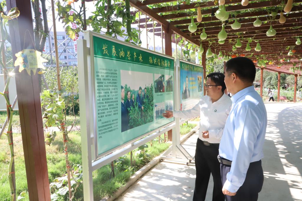 园艺学院院长龚守富向刁玉华介绍了园艺学院智慧园艺实习基地的概况及建设历程,在瓜果长廊下,刁玉华副厅长详细询问了我院学生参加实践情况、学院特色优势专业学科建设发展情况及产学研工作开展情况。在油茶科普园中,刁玉华向负责老师了解油茶种植、生产、销售等方面内容。