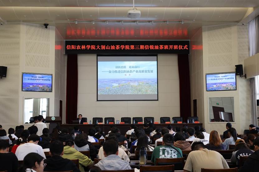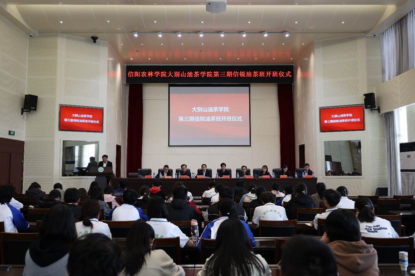 2023年10月13日,大别山油茶学院在图书馆六楼报告厅成功举行了第三期信锐油茶班开班仪式。信阳市政府机关党组成员、市林业和茶产业局党组成员、市油茶产业发展中心主任陈犁、beat365在线平台官网副校长刘开华、信阳市油茶产业协会秘书长陈廷森、信阳市林科所副所长卜付军、信阳信锐油茶股份有限公司办公室主任都方方、beat365在线平台官网发展规划处处长杨刚、beat365在线平台官网教务处副处长唐芳、大别山油茶学院院长龚守富、大别山油茶学院副院长张琰教授、大别山油茶学院教师代表及第三期油茶班全体学员参加了开班仪式。开班仪式由大别山油茶学院副院长李蒙主持。