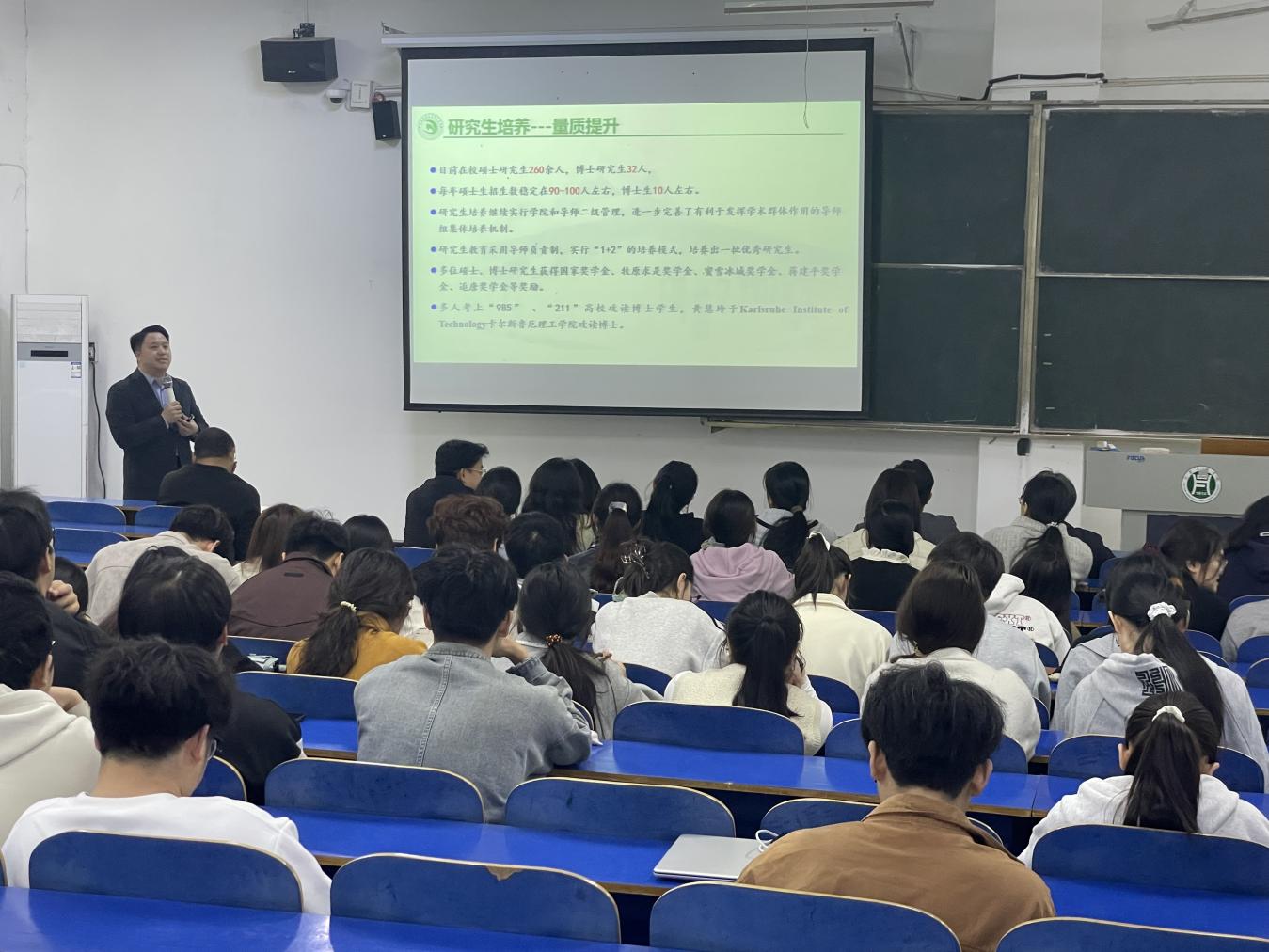 龚守富对河南农业大学园艺学院一行的到来表示热烈欢迎,介绍了本次宣讲会的目的与意义,希望参会学生珍惜此次学习交流机会,合理规划学业发展。同时,他强调了双方在人才培养、科研创新等方面的合作基础,期待以此次宣讲会为契机,进一步深化两校学科交流与人才输送。胡建斌详细阐述了河南农业大学园艺学院的发展历程、学科优势、师资力量及科研平台建设情况。赵仁亮详细解读了该校2026年硕士研究生招生调剂的基本条件、具体要求、调剂程序及时间安排,重点说明调剂考生的初试成绩要求、专业匹配原则、复试遴选规则等核心内容,为考生提供了清晰的调剂指引,帮助考生精准把握调剂机会。学生围绕调剂流程、复试准备、专业研究方向、就业前景等问题积极提问,郭娟、胡建斌、赵仁亮三位老师逐一耐心解答,结合自身专业经验给出针对性建议。