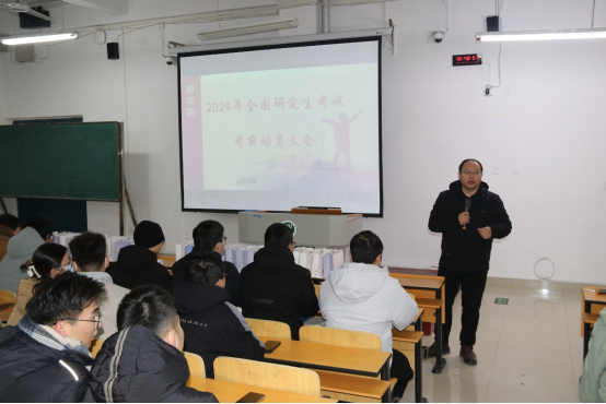 2024年全国研究生考试将于即将举行,为缓解考研压力,增强迎考信心,12月21日药学院在二教306召开“‘研’途星辰,温暖随行”研究生考试考前动员大会,为考研学子加油打气。副校长李益民、学工部部长靳潢受邀出席并为考研学子送祝福。药学院党总支副书记李娜、副院长王家东、毕业班辅导员和221名考研学生参加动员会。会议由李娜主持。