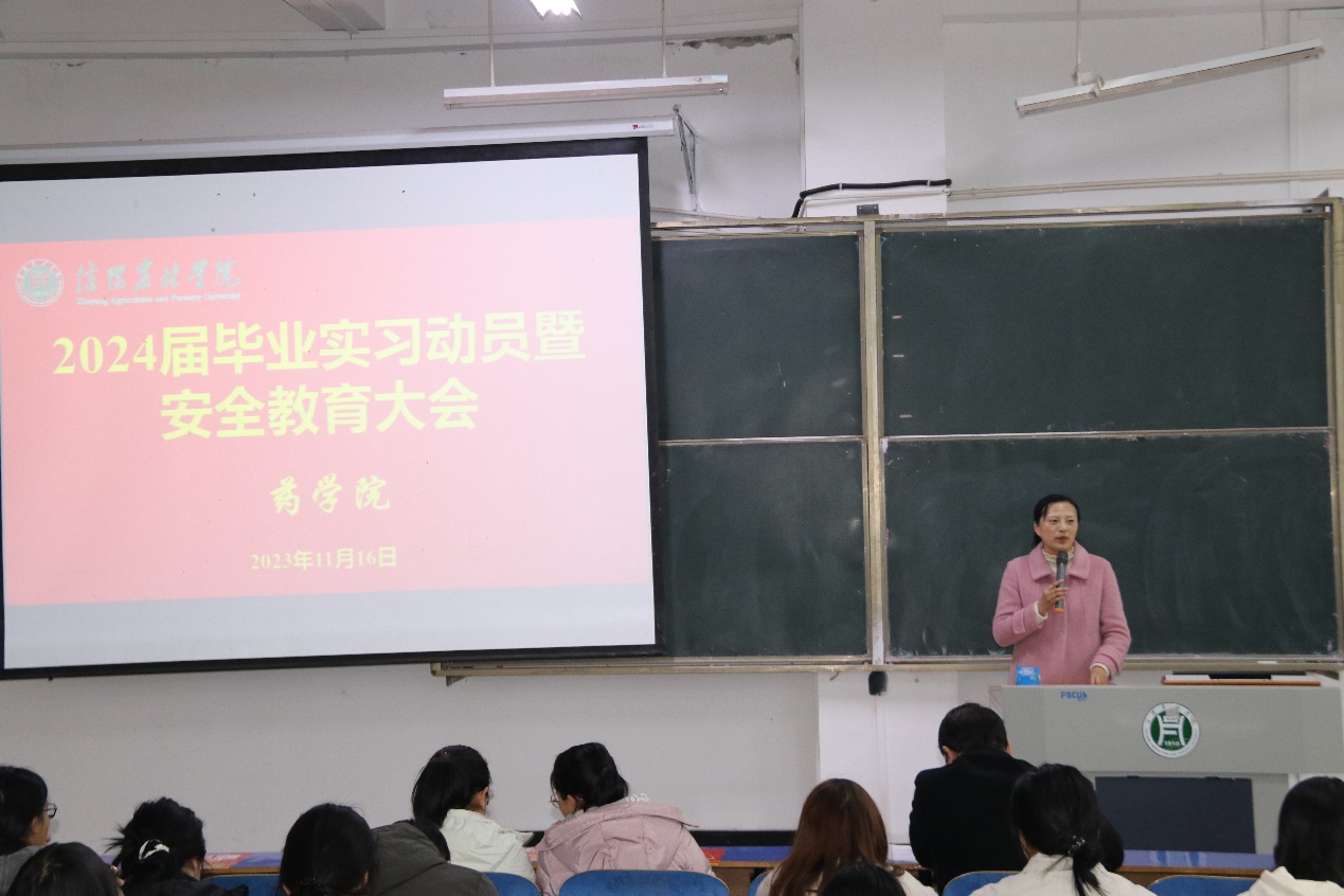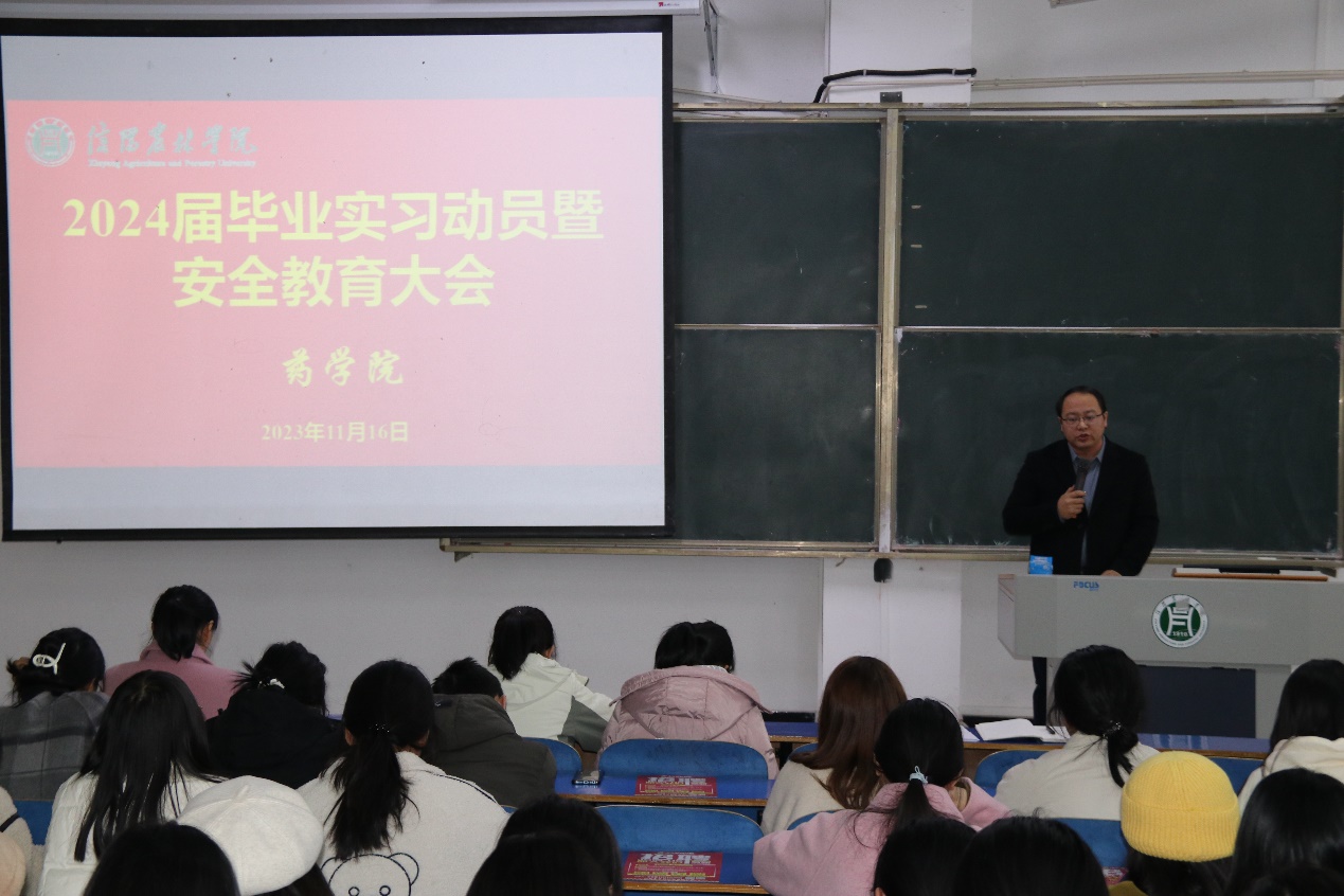 为引导毕业生树立正确的实习观、就业观,进一步增强毕业生实习安全意识,顺利完成毕业实习、就业实习,11月16日下午,药学院2024届毕业生毕业实习动员暨安全教育大会在一教E102成功召开。药学院副院长王家东(主持工作)、党总支副书记李娜出席大会并讲话,学院教学秘书、各教研室主任(专业负责人)、毕业班辅导和全体2024届毕业生参加动员会。会议由学院教学秘书刘柱明主持。