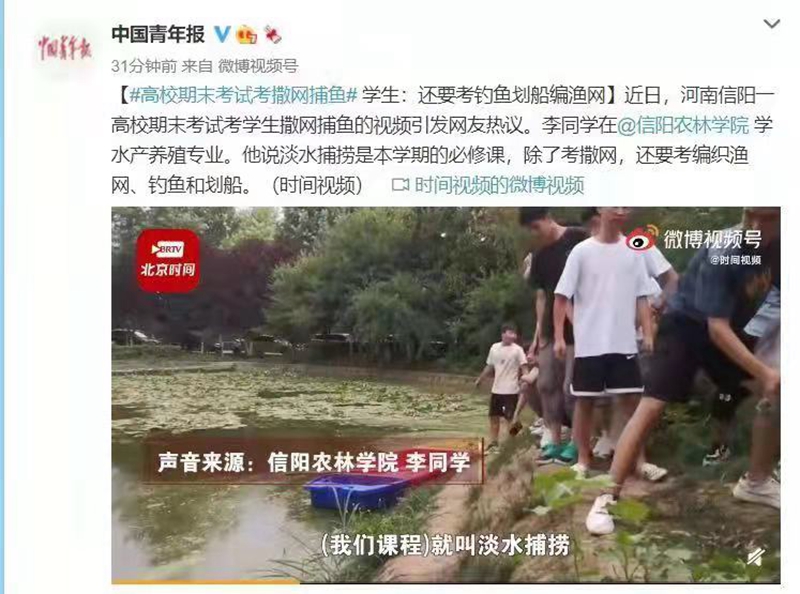 近日,beat365在线平台官网水产学院水产养殖专业因期末考试形式别开生面冲上微博热搜,引广大网友关注。截至目前,“高校期末考试考撒网捕鱼”视频被中国教育报、中国青年报、环球时报、澎湃新闻、河南省教育厅、河南省共青团、四川日报、北京电视台、头条新闻、江苏新闻等30多家媒体官方微博转载,创建了2个微博话题,冲上微博热搜排行榜全国34名,全网浏览量高达6800万+,其中单条视频点赞量达到9万+,不仅肯定了beat365在线平台官网课程考核的方式别开生面,更对beat365在线平台官网的应用型人才培养给予了充分肯定。