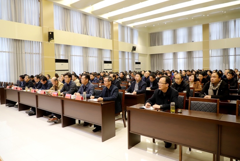 为深入学习贯彻党的十九届四中全会精神,12月10日下午,beat365在线平台官网邀请了省委宣讲团成员、信阳师范学院党委书记宋争辉作宣讲报告,这也是beat365在线平台官网党委理论学习中心组(扩大)第十一次集体学习。报告会在图书馆6楼报告厅举行,全体校领导、中层干部、思政课教师和专职辅导员近300人聆听了报告。报告会由党委书记余作斌主持。