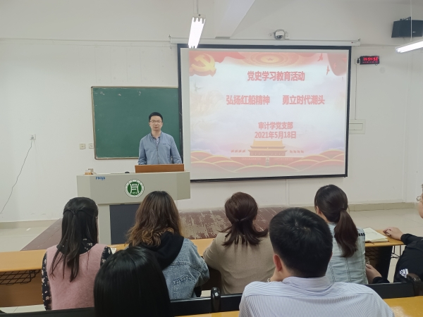 为深入开展党史学习教育,从党的百年伟大奋斗历程中汲取继续前进的智慧和力量,推动党史学习教育往深里走、往心里走、往实里走。财经学院审计学党支部于2021年5月18日下午于2教107开展主题为“弘扬红船精神,勇立时代潮头”的党史学习主题教育,本次活动由毛帅老师讲授,全体支部成员参加了此次活动。