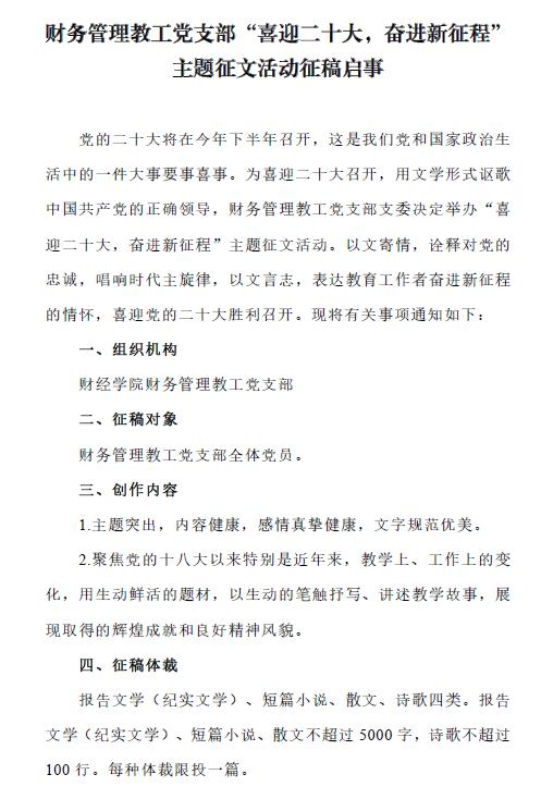 为进一步坚守高校教师立德树人根本任务,引领广大教师党员弘扬伟大建党精神,传承红色基因,坚定理想信念,财务管理教工党支部9月份下发了《“喜迎二十大,奋进新征程”主题征文活动征稿启事》,动员支部全体党员积极参加,以实际行动迎接党的二十大胜利召开。
