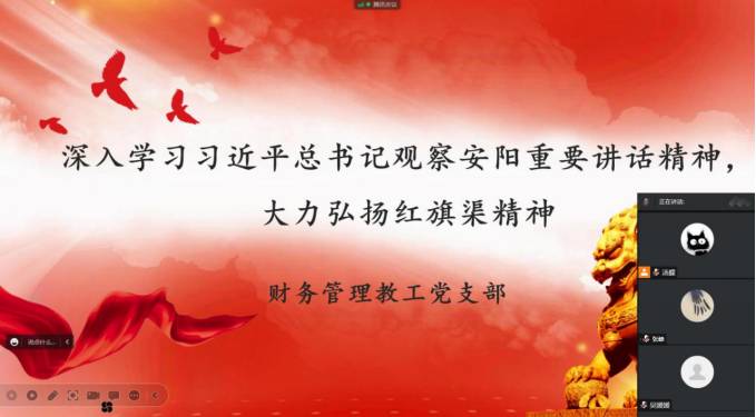 11月22日,财务管理教工党支部召开“深入学习习近平总书记视察安阳重要讲话精神,大力弘扬红旗渠精神”专题组织生活会。会议以线上形式进行,支部书记李静主持,支部全体党员参加。
