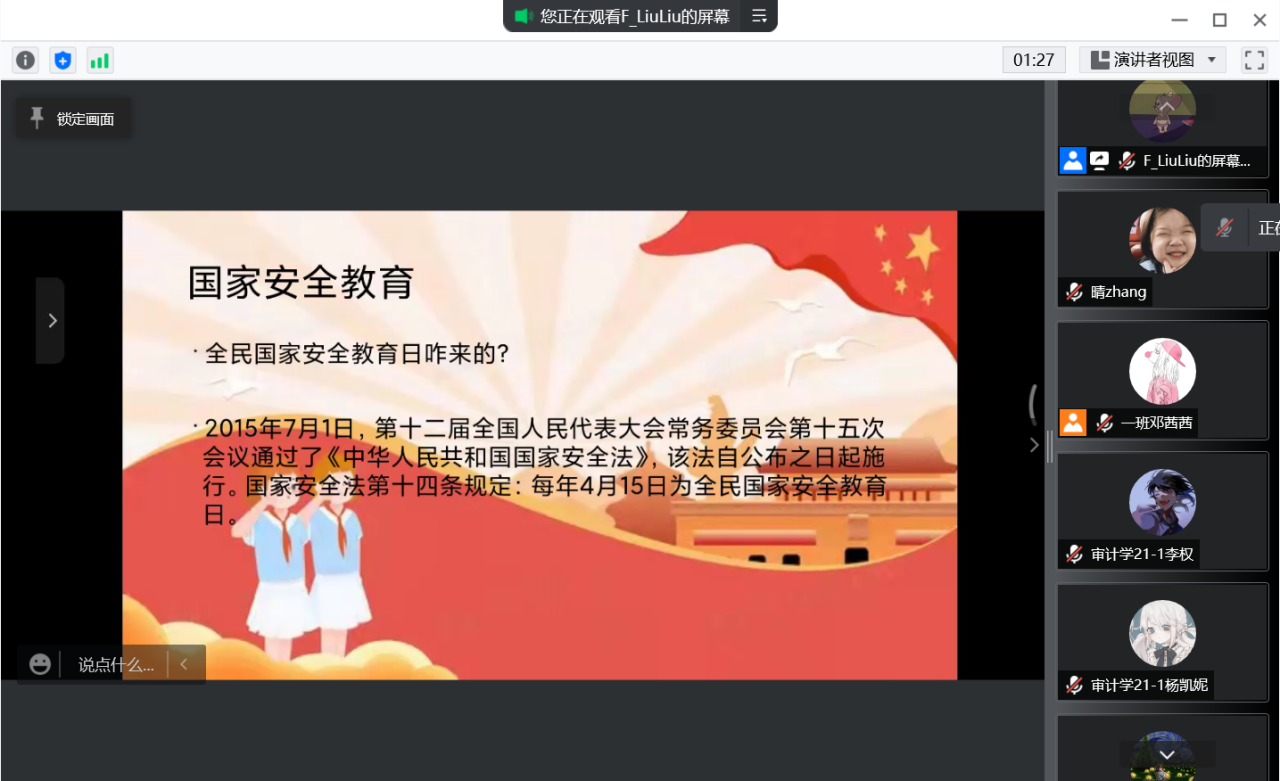 4月13日学院全体班级利用课前十分钟活动开展国家安全知识学习,各班负责人给同学们讲解了国家安全的含义、国家安全的内容,以及作为当代大学生我们应怎么维护国家安全、如何培养安全意识等内容。