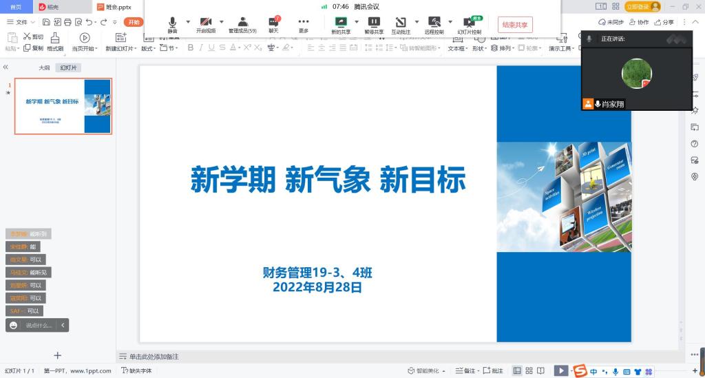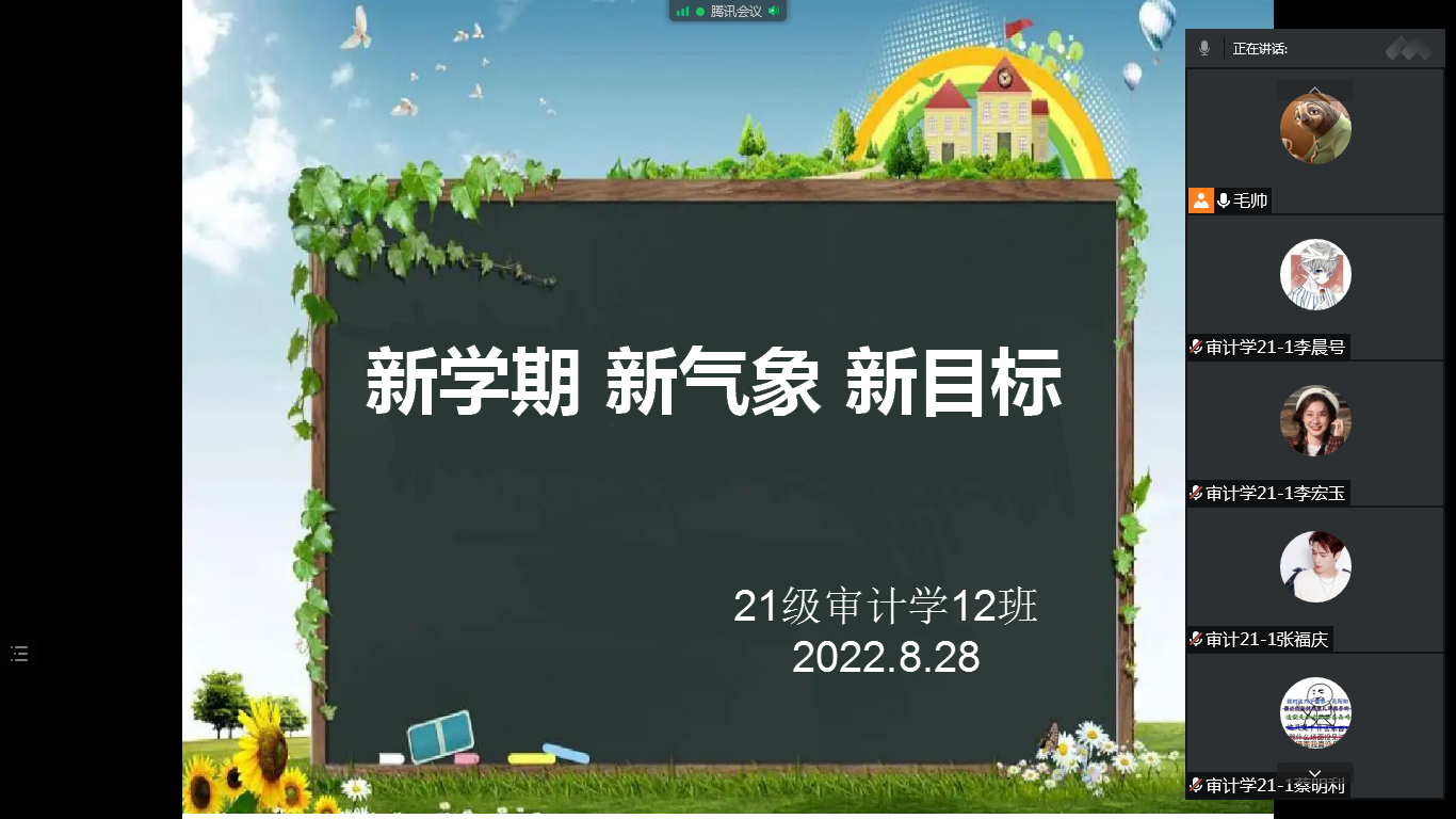 为做好疫情防控工作,增强同学们的安全防范意识,确保新学期各项工作地有序开展,财经学院于8月27-28日,各班分别召开“新学期 新气象 新目标”线上主题班会,会议由各班辅导员主持,全体学生参加。