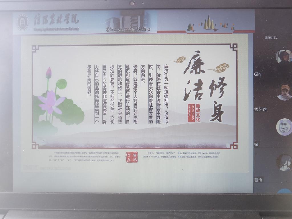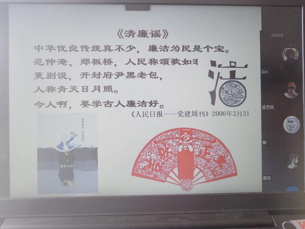 王老师带领同学们学习了习近平总书记关于党风廉政建设的重要讲话内容,讲解了“何为廉”、“为何廉”、“如何廉”的问题。通过观看昔日风光无限、如今失去自由、身陷囹圄的贪腐官员短片资料,用真实的案例让同学们感受到贪腐的危害,树立廉洁自律意识。王老师结合大学生学生干部评选、奖助学金评定、专业竞赛等方面,为同学们分析了如何在生活中做到清正廉洁,她要求同学们要“出淤泥而不染,濯清涟而不妖”,提升抵抗腐败的免疫力,树牢清明廉洁、诚信做人的意识,端正作风,磨练品行,传承美德,共同维护和谐清朗的校园氛围,用青年人的志气、骨气和底气为美好的未来不懈努力。