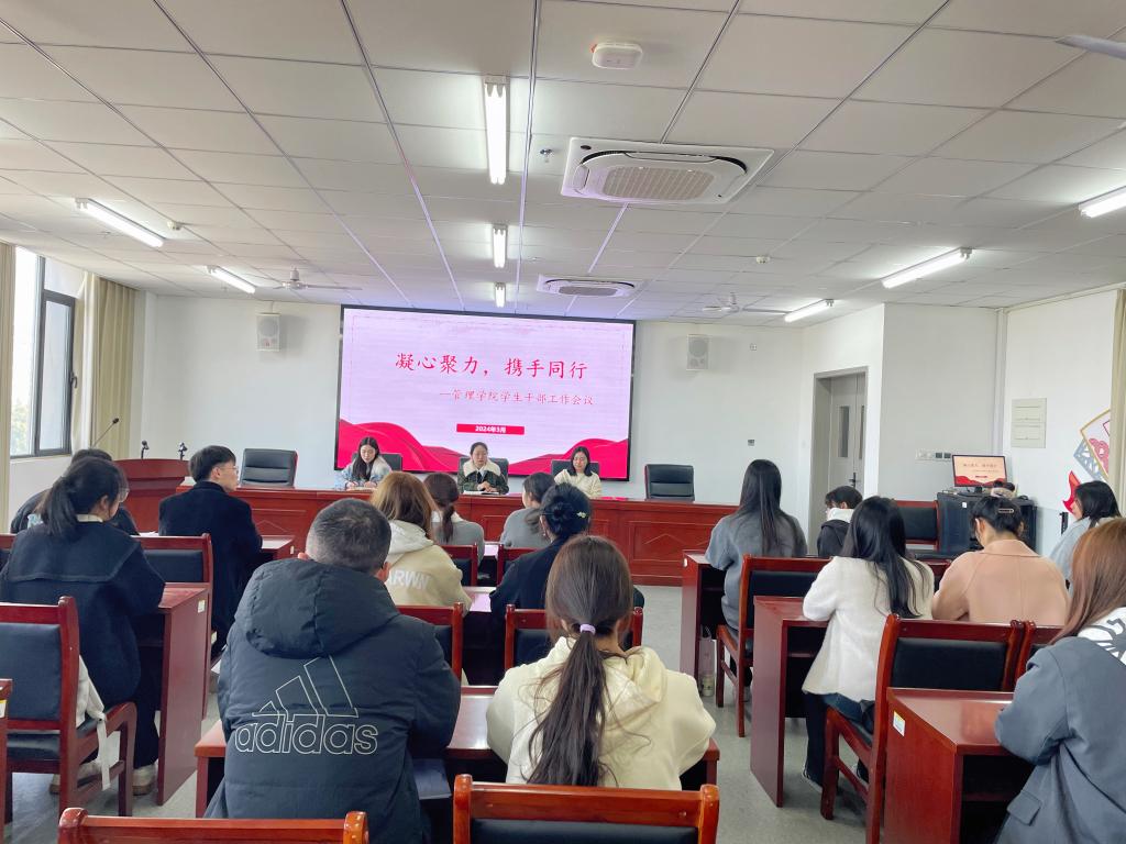 为进一步加强学生干部管理、提升学院学风建设,管理学院于3月11日召开“凝心聚力、携手同行”学生干部工作会议。本次会议由管理学院党总支副书记刘璐璐主持,组织员李春月、辅导员容翊贝、王中颖、王晓萌及各年级学生干部代表40余人参会。