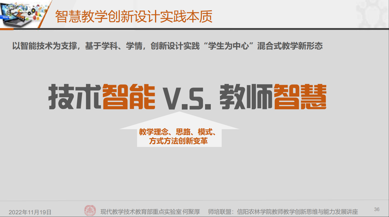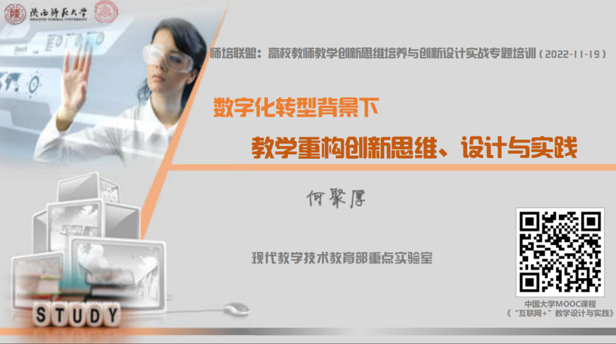 本次专题培训的主讲嘉宾为陕西师范大学现代教学技术教育部重点实验室副主任、博士生导师何聚厚教授。培训中,何教授从“教学创新思维发展”、“教学重构创新设计”和“教学创新设计实践”三个方面分别对数字化转型背景下教师教学能力发展内涵、基于翻转课堂教学重构智能技术支撑的混合式教学和基于国家智慧教育公共服务平台设计实践混合式教学进行了分析。何教授强调,要以学生的发展为中心、以学生的学习为中心、以学习效果为中心,科学、规范地开展以学生为中心的教学创新活动。
