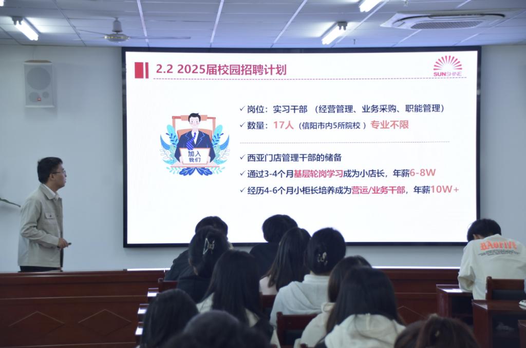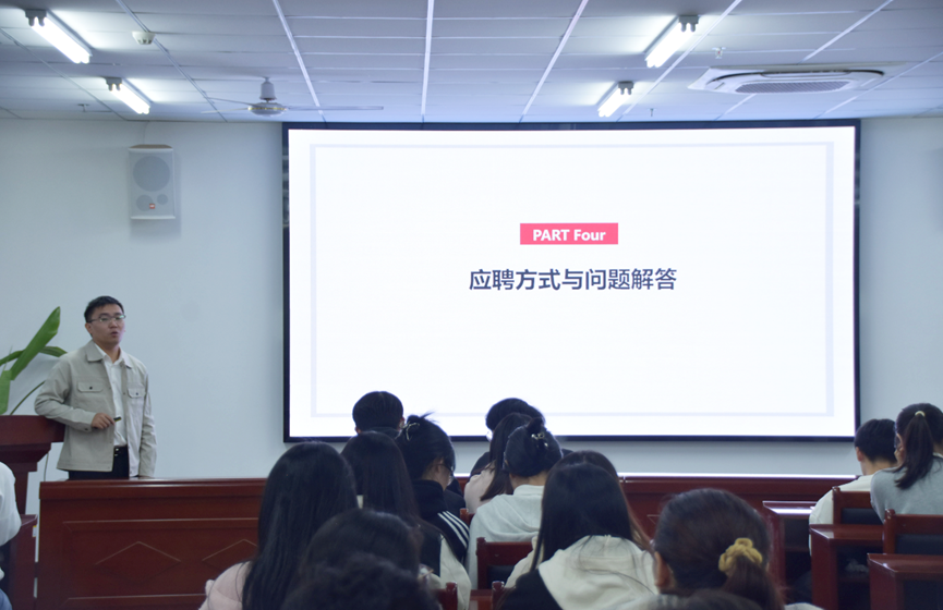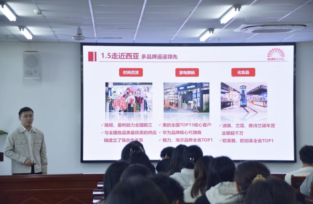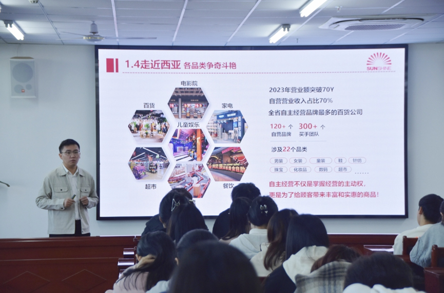 接下来,闵经理从了解零售,走近西亚;遇见未来,人才需求;成长发展,薪酬福利;应聘方式与问题解答这四方面向同学们做了详细的介绍。着重介绍了西亚和美商业股份有限公司2025届校园招聘计划及培养方式,并向大家介绍了学校的优秀校友代表,这些榜样的力量大大提升了同学们就业的积极性。