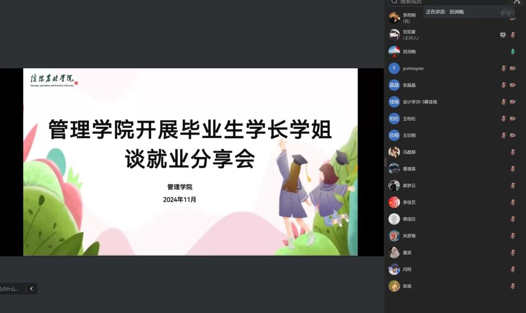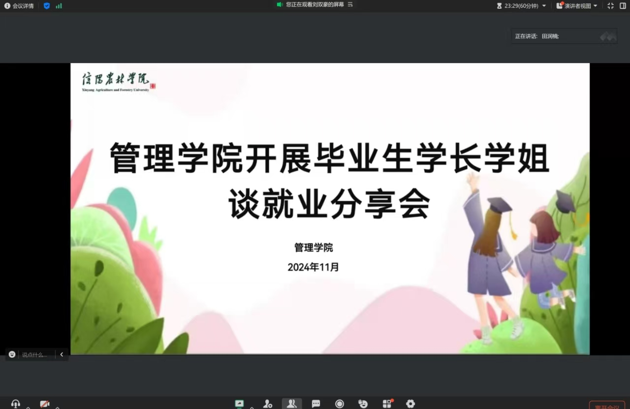 为帮助即将步入职场的低年级学生了解就业市场,更好地规划自己的职业发展道路,提前做好就业准备,11月9日,管理学院在线上举办了一场别开生面的毕业生学长学姐谈就业分享会,本次分享会邀请了五位学长学姐为大家传授经验。