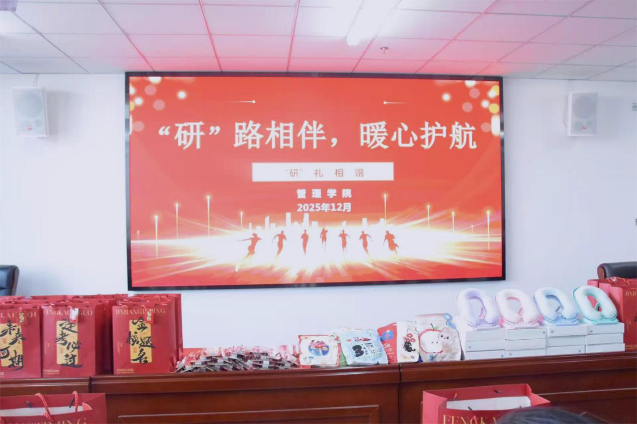 为有效舒缓考研学子临考压力,切实传递学院关怀,管理学院于12月5日在双创楼408会议室开展“研”路相伴,暖心护航系列活动之“研”礼相赠活动,学院党委副书记刘璐璐,就业专员荣翊贝、卢鑫、陈玉等老师出席,为在场备考的毕业班学生加油鼓劲并赠送暖心礼包。