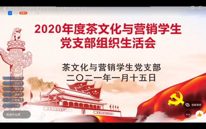 1月15日中午,茶学院茶文化与营销学生党支部在钉钉上召开了线上组织生活会暨民主评议党员会议。会议由党支部书记丁岚主持,支部全体党员参会。