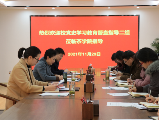 茶学院党总支副书记朱建梅从“着力夯实阵地,推动党史学习教育热起来”、“着力创新形式,推动党史学习教育活起来”、“着力打造特色,推动党史学习教育亮起来”、“着力为‘民’办事,推动党史学习教育实起来”四个方面,对学院党史学习教育开展以来的实际工作进行了详细汇报。督查组重点了解了学院学习教育工作是否有序推进、专题学习是否按计划开展、“我为群众办实事”实践活动开展是否扎实。
