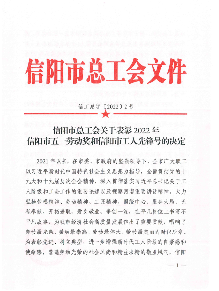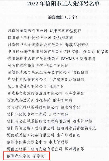 日前,信阳市总工会发文(信工总字〔2022〕2号)表彰2022年信阳市五一劳动奖章、奖状和工人先锋号,茶学院荣获2022年“信阳市工人先锋号”称号,全市仅有22家先进集体受到表彰。