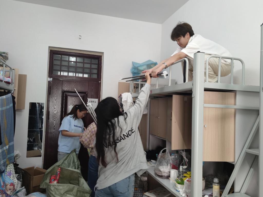 在为学生整理宿舍物品时,支部学生党员通过视频方式与毕业生进行沟通交流,分工配合,按照毕业生的要求细心查找、精心整理,将个人物品进行分类收纳,确保学生个人物品准确齐全,然后进行打包装箱并做好邮寄单号记录。