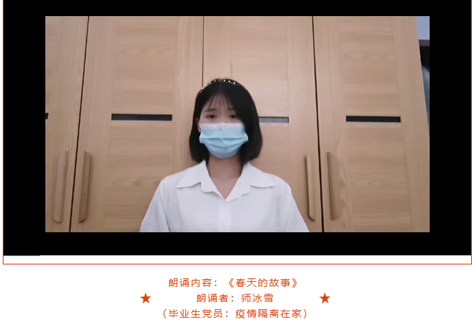 支部所有党员自选了习近平总书记重要讲话、红色经典进行诵读,由于疫情原因无法返校的毕业生党员也在家或实习单位录制朗诵内容参与到党日活动中来。学生党员用饱含真情的朗诵,全面回顾了百年党史,深情讴歌了党的丰功伟绩和祖国的雄姿风采,令人精神振奋、心潮澎湃。本次朗诵激发了学生党员同志爱党爱国热情,激励正值风华正茂的青年们,以青春之我发出最强音,以奋斗之我争做新时代的先锋。茶学院党总支副书记朱建梅、支部丁岚、梁玉洁为各位学生颁发了纪念品。