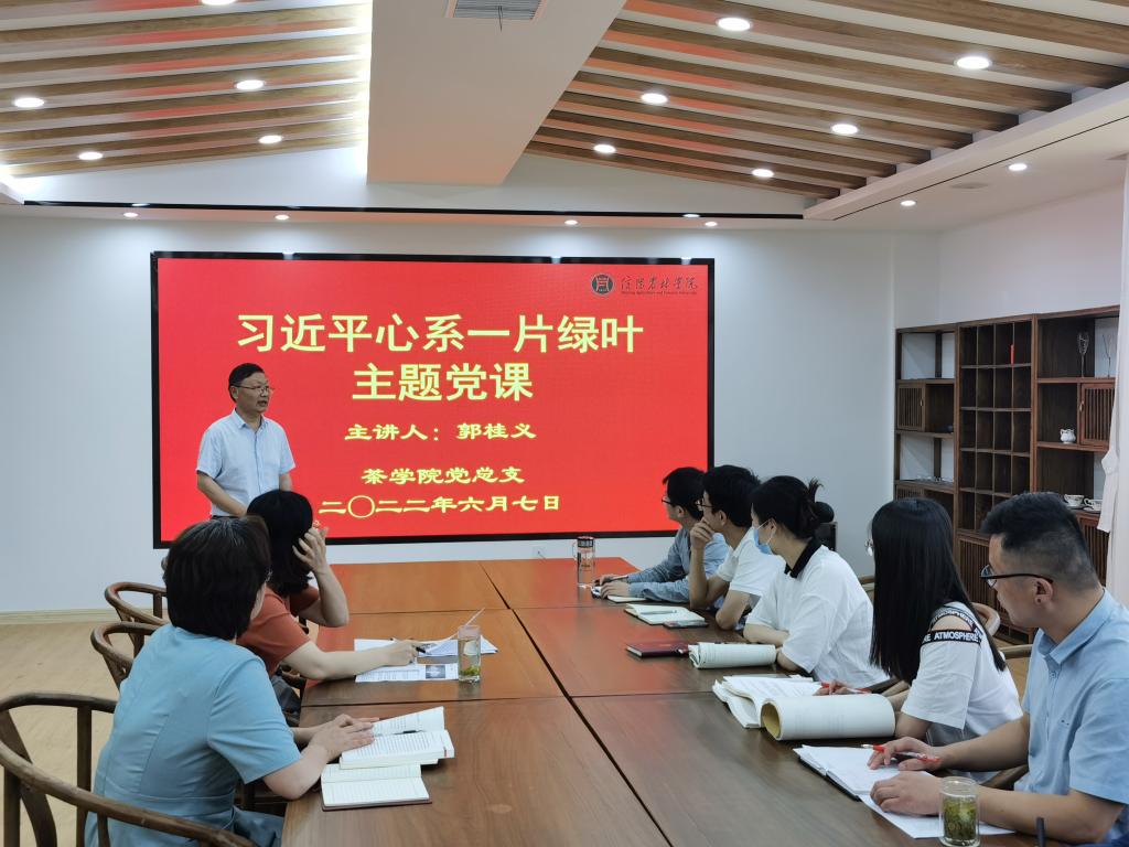 6月7日下午,茶学院党总支书记、院长郭桂义教授在1C201为全院教师讲“习近平心系一片绿叶”主题党课。