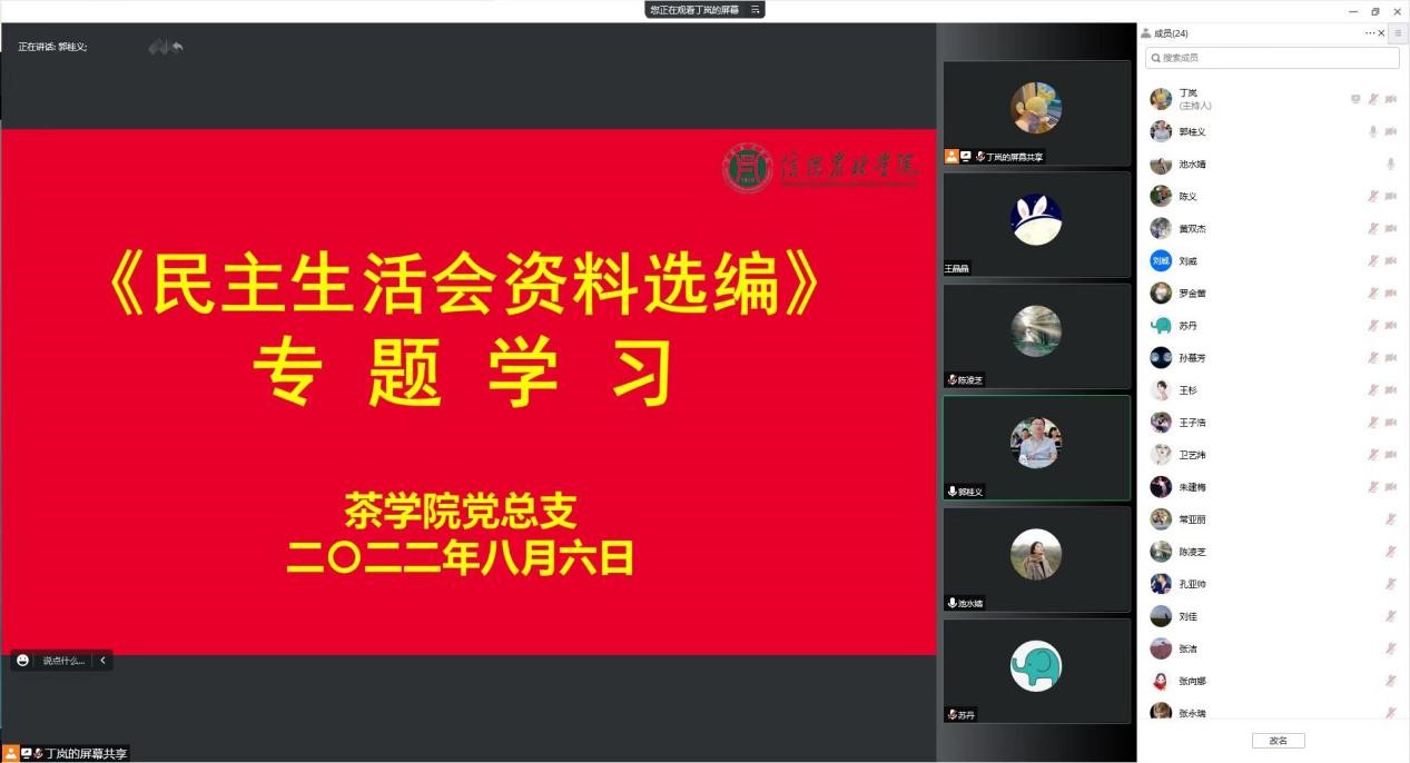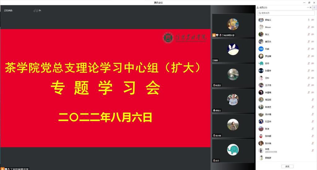 8月6日下午,茶学院党总支通过腾讯会议召开理论学习中心组(扩大)专题学习会,学习《干部工作学习资料选编》。茶学院党总支书记、院长郭桂义,副院长孙慕芳、陈义及全体科级干部参加会议,会议由党总支副书记朱建梅主持。