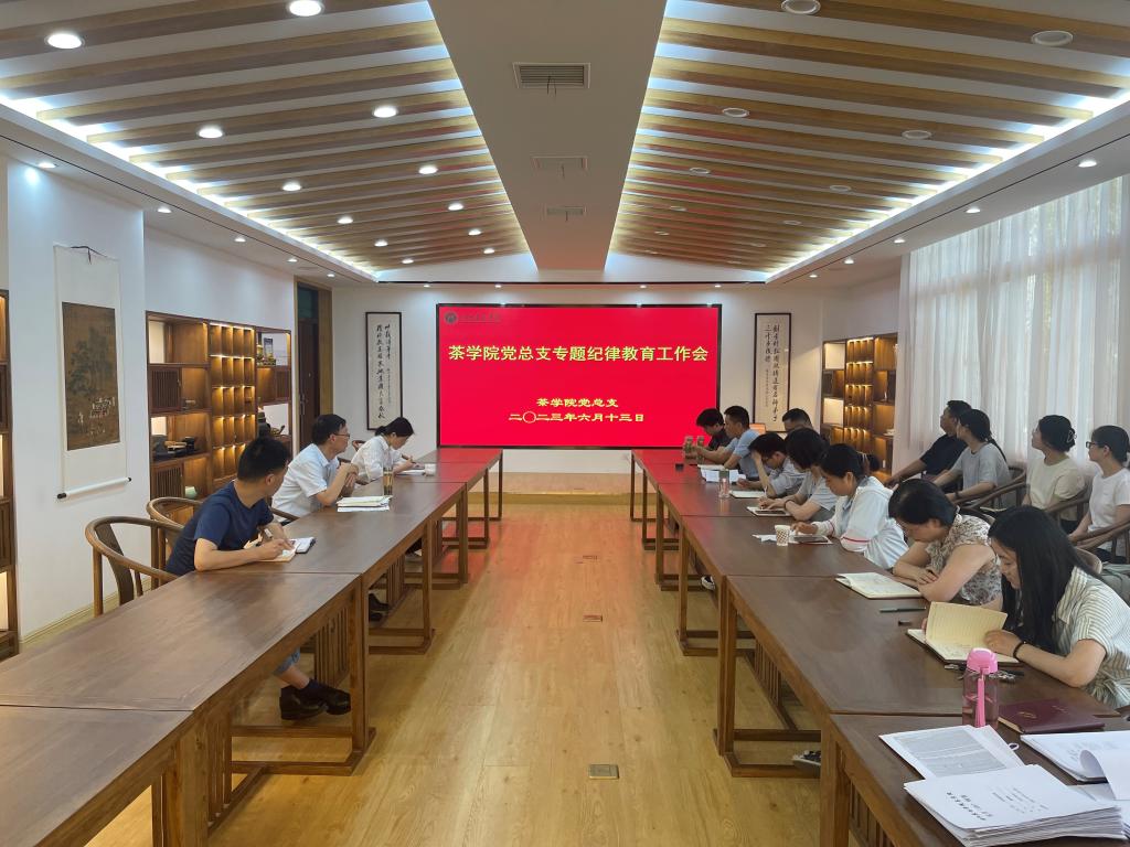 为深入贯彻落实党的二十大精神和习近平总书记关于严明党的纪律和规矩的重要论述,全面加强党的纪律建设,教育引导全院党员干部学纪、明纪、守纪。6月13日下午,茶学院党总支于科技楼1C201召开专题纪律教育工作会。茶学院党总支书记、院长郭桂义、副院长陈义、党总支副书记、纪检委员朱建梅及全体教师参会。会议由朱建梅主持。