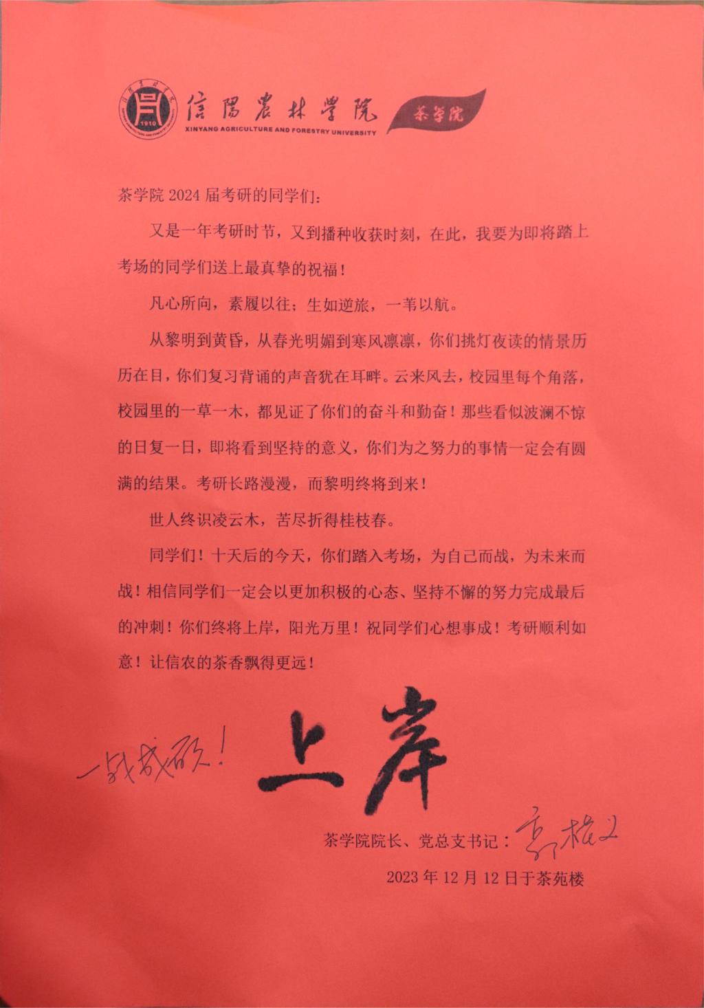 茶学院院长党总支书记郭桂义教授向同学们表示亲切慰问。他肯定了同学们坚持学习、克服困难、不断超越的奋发精神,并以学院优秀毕业生的事例,寄语同学们“学会求知、学会做事、学会做人”,永葆对科学知识的敬畏和热忱,永不松懈对自我的要求和管理。郭院长还叮嘱同学们在备考最后阶段,既要按照计划持之以恒地学习,也要保持良好的心态,劳逸结合。他祝愿同学们考出好成绩,走向更广阔的天地,让信农的“茶香”飘得更远!