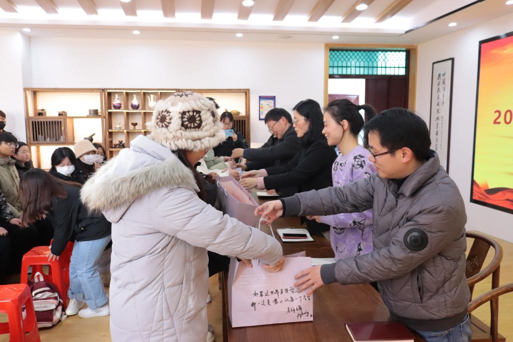 活动伊始,党总支副书记朱建梅老师亲切问候考研学生,并代表学院全体教师为积极备考的学子表达了殷殷期盼和关爱之情。随后各位领导老师为考研学子送上了学院精心准备的“考研福袋”:考研“旺旺”,心想事“橙”、如你“薯愿”、“苹”安顺利,“暖”意融融,包含了学院对考研学子的美好祝愿。