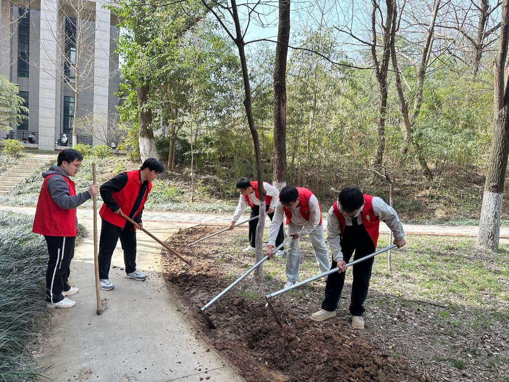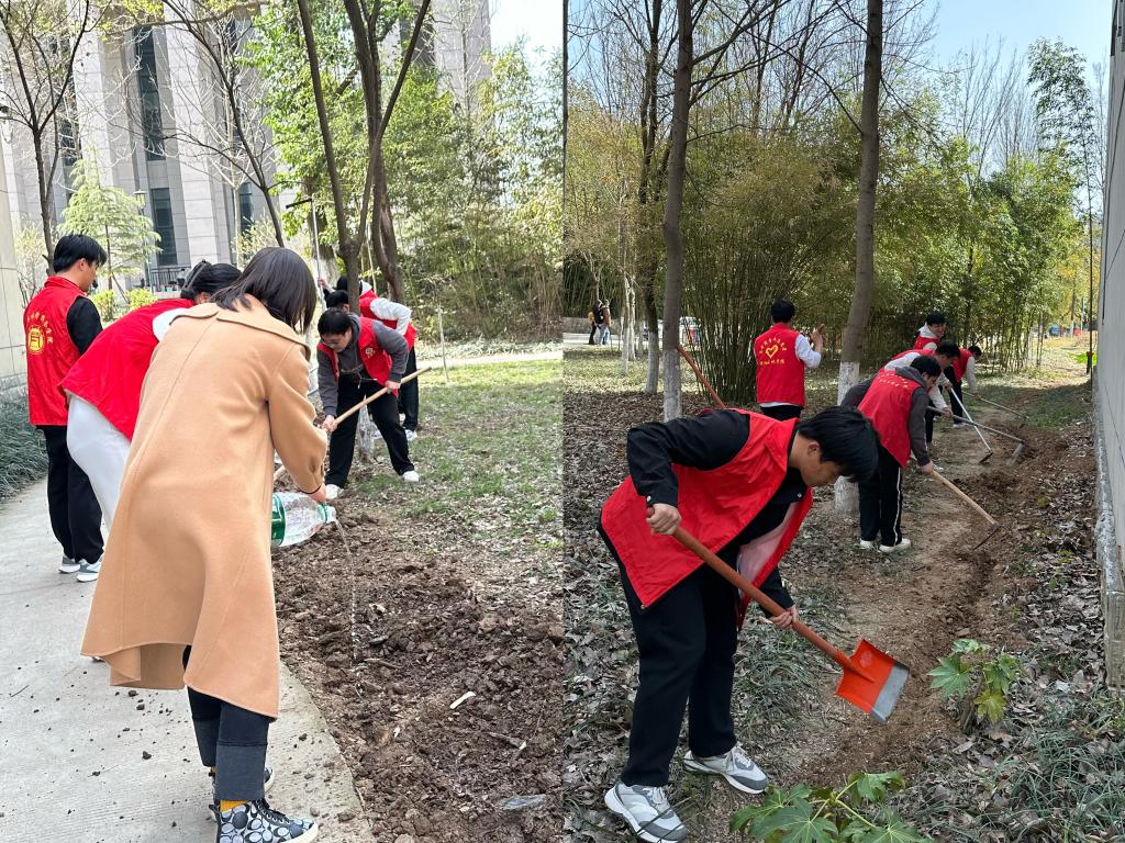 活动现场,师生们纷纷拿起翻土工具投入到植树活动中,挥锹铲土、铲平土块、捡拾垃圾,精心细致翻开板结的土块,提水浇灌土地,而后撒下了花苗,共同为美丽校园增绿添彩。支部还有部分学生走进学校桃园,清扫垃圾,营造美好的踏春赏花环境。