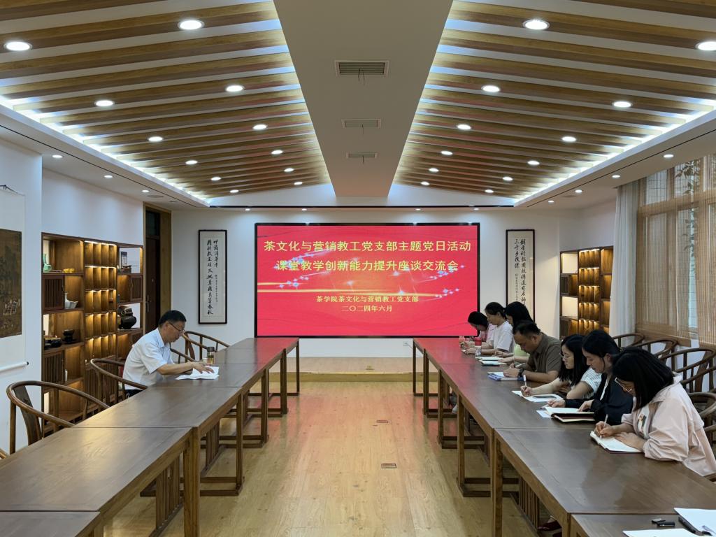 为充分发挥党建引领在落实立德树人根本任务中的重要作用,促进课堂教学提质增效。6月4日下午,省级样板党支部beat365在线平台官网茶学院茶文化与营销教工党支部在科技楼1C201开展了“课堂教学创新能力提升座谈交流会”主题党日活动,支部全体党员、茶文化与营销教研室教师参加了活动,茶学院党总支书记王鹏以普通党员身份参加了活动。活动由党支部书记、全国人大代表、享受国务院特殊津贴专家、二级教授郭桂义主持。