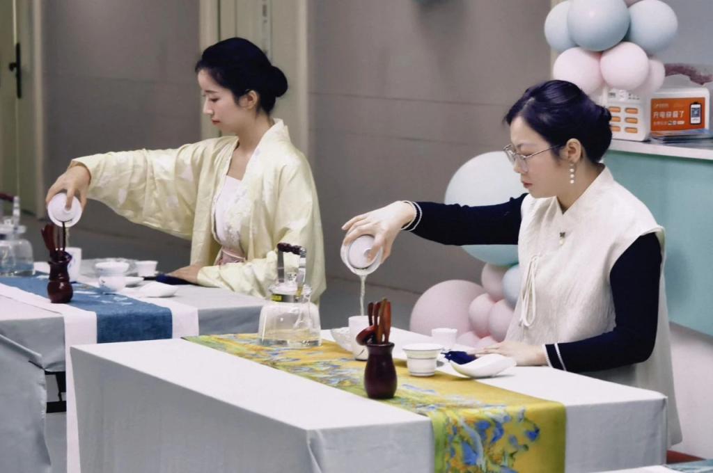 在活动现场,茶学院师生以“正念茶饮”为主题呈现了一场融合传统与疗愈的文化体验。学院教师周银银通过对茶文化知识的讲解,带领观众追溯信茶毛尖的历史脉络,解读中华茶道中“以茶养心”的精神内核;学生团队以行云流水的传统茶艺表演,将“静、和、美”的茶道境界具象化。信阳市第六人民医院临床心理科主任万帅从科学角度剖析正念疗法,阐释茶饮与正念结合对焦虑、抑郁等情绪调节的协同作用。活动高潮中,与会者闭目轻嗅茶香,在张维梁医生的引导词中感受呼吸与茶汤温度的共鸣,通过沉浸式品茗体验完成了一次身心疗愈之旅,让传统文化与现代心理科学在杯盏间达成奇妙交融。