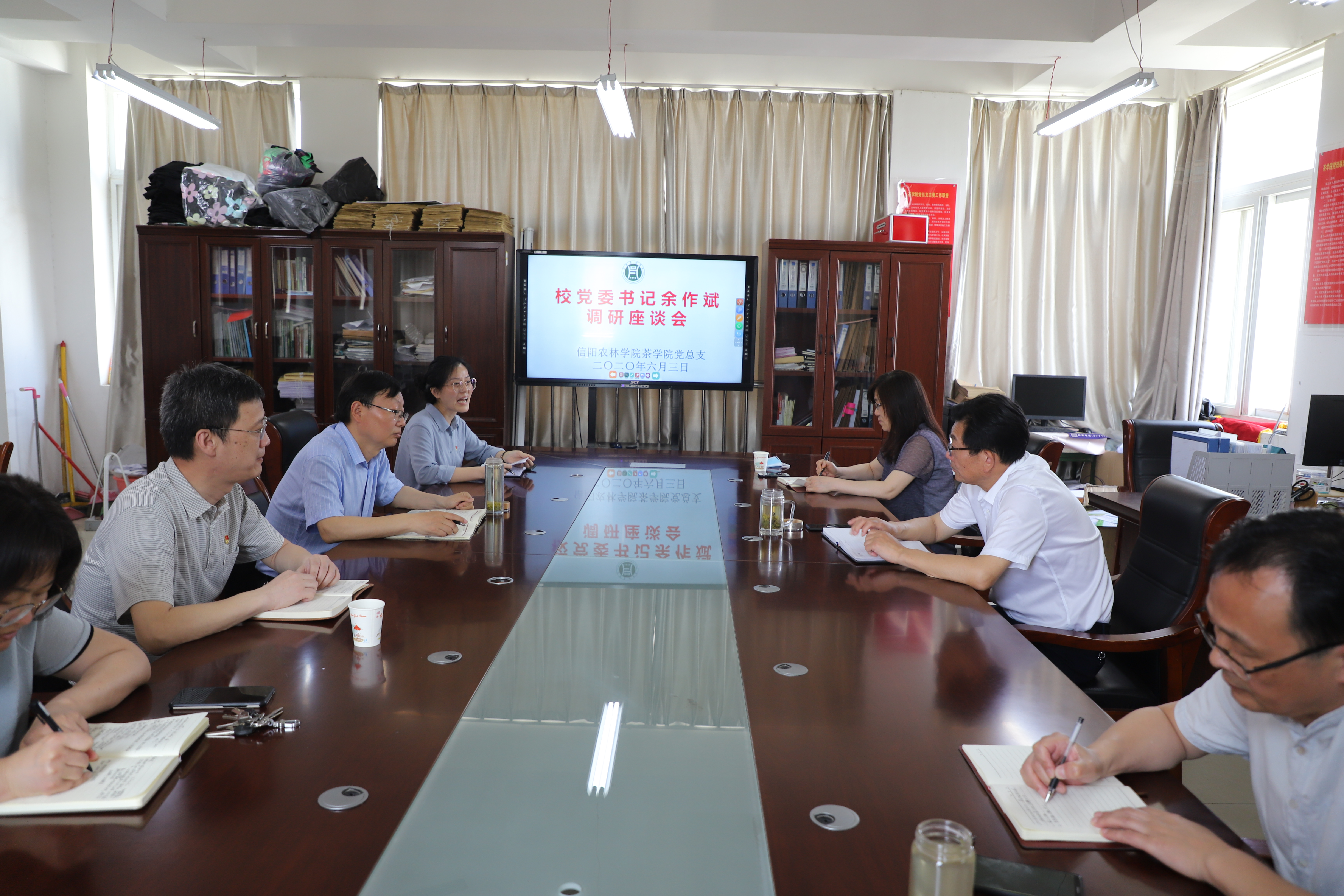6月3日上午,校党委书记余作斌,校党委办公室主任何涛,统战部常务副部长张婷莅临茶学院调研指导工作,就我院毕业生返校情况、就业率,线上教学质量把控,本科教学工作合格评估,疫情期间学生思想引领、师生民族宗教工作等事项进行调研座谈。会议由茶学院党总支书记袁丁主持,茶学院领导班子成员出席座谈会。