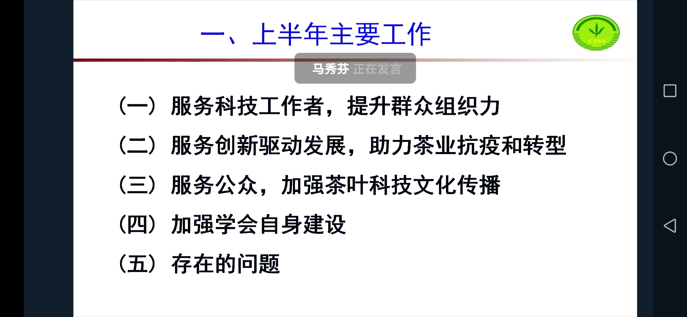 会议总结了中国茶叶学会上半年工作,谋划了下半年工作。2020年上半年,学会面对突发新冠肺炎疫情,坚持党的领导,坚定信心,积极应对,及时改变工作思路与工作策略。积极参与科学抗疫防疫,服务茶业复产转型;创新科普传播方式,开展线上公益直播,举办“美美与共”云茶会,迎接首个“国际茶日”;举办“科技为民奋斗有我”科技工作者日系列活动,弘扬科学家精神;创新培训形式,线上线下结合培养专业人才和技能人才,推荐全国创新争先奖;筹备“第十一届海峡两岸暨港澳茶业学术研讨会”“2020国际茶叶大会”;完善学会奖励制度,加强信息化建设。各项工作稳步推进,被中国科协评为“优秀抗疫学会”。参会常务理事对学会上半年工作给予了肯定,建议学会在做好茶叶科普传播,专业技能人才培养等工作的同时,科技服务工作中要进一步加强与各地农业主管部门的联系,在服务产业,助力乡村振兴等方面发挥更大作用。