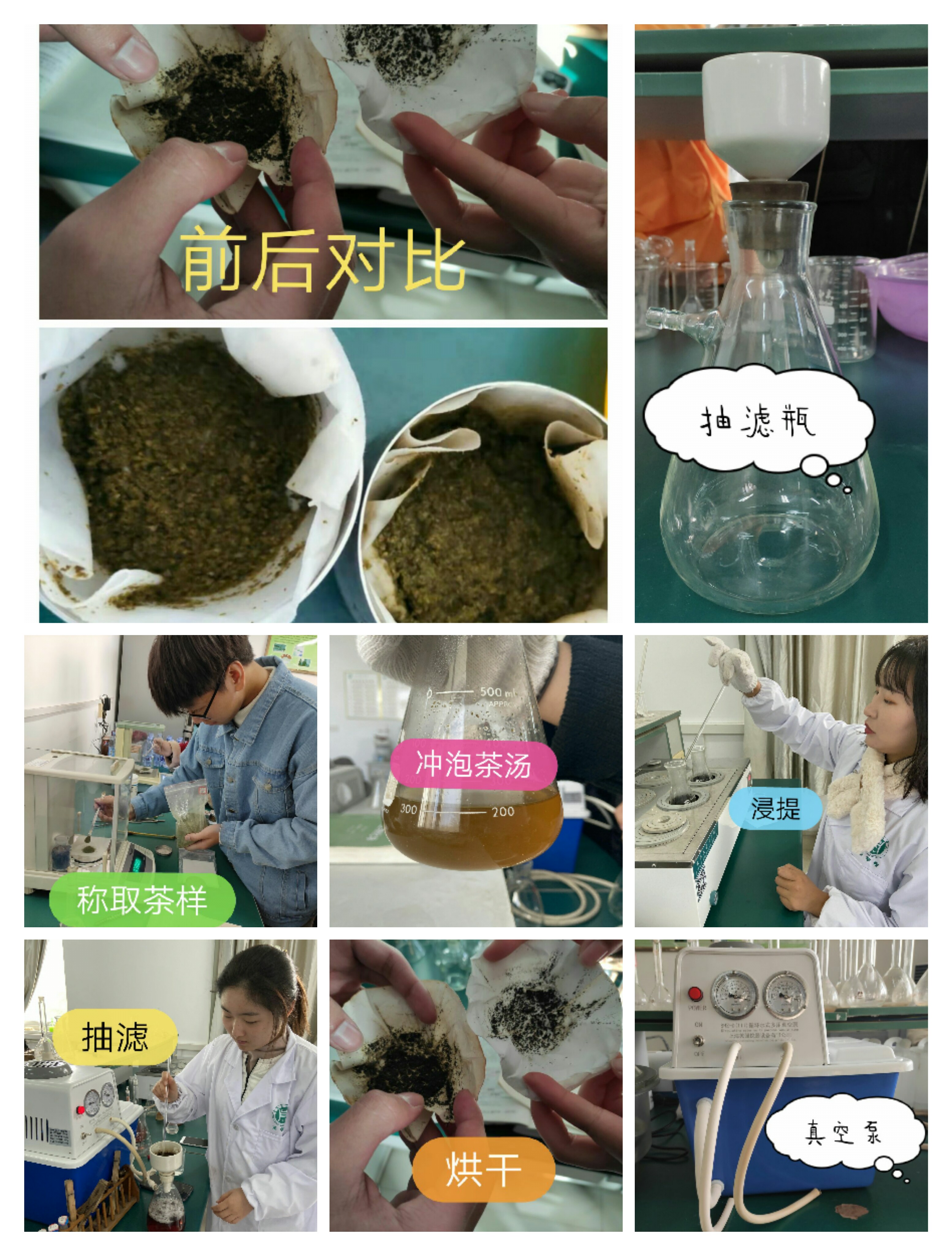 本课程实习共开出实验室安全及主要仪器设备操作、茶叶中水分测定、茶叶中水浸物测定、不同季节绿茶中茶多酚含量的变化、不同种类茶叶中咖啡碱含量的比较、不同种类茶叶中游离氨基酸总量的比较等6个实习项目,总计30个学时。实习伊始,指导老师带领同学们共同学习了《beat365在线平台官网实验室安全手册》,并签订有实验室安全承诺书。本次课程实习使用的样品为2017级本科《制茶学》实训周加工的红茶与绿茶。实训过程中,老师科学示范,学生认真动手实践,茶汤制备、试剂配制、实验现象观察、仪器设备操作、数据分析等环节紧密相扣,理论与实践相结合,切实提高了学生的专业技能。