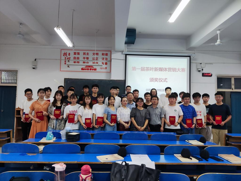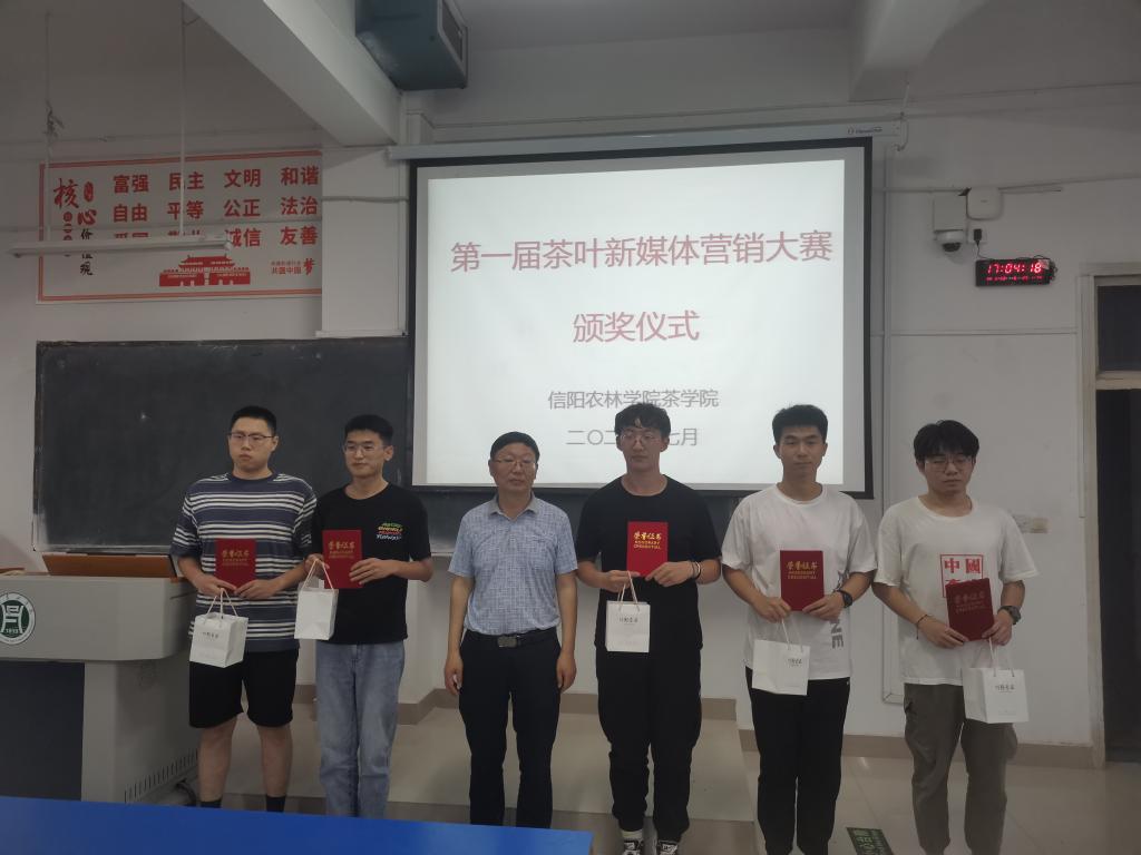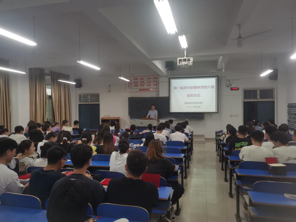 7月2日下午17:00,茶学院在一教A105举行了第一届茶叶新媒体营销大赛颁奖仪式。茶学院院长郭桂义、茶文化与营销教研室教师池水婧、张洁、夏雨出席颁奖仪式,茶学(创新拓展)2018、茶学(对本)2018、茶学(专升本)20全体同学参加了本次颁奖大会。