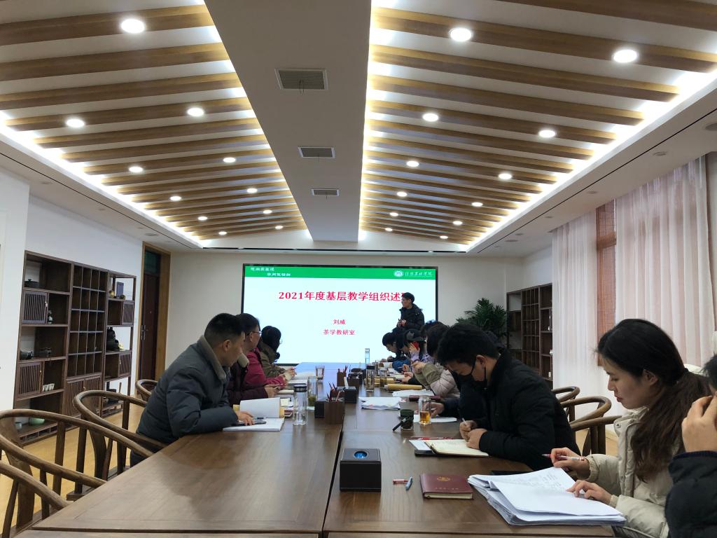 2022年1月4日下午,茶学院在科技楼1C201召开2021年度基层教学组织述职报告会。茶学院党总支书记、院长郭桂义,副院长孙慕芳、陈义,党总支副书记朱建梅,以及全体教师参加了会议。会议由副院长孙慕芳主持。