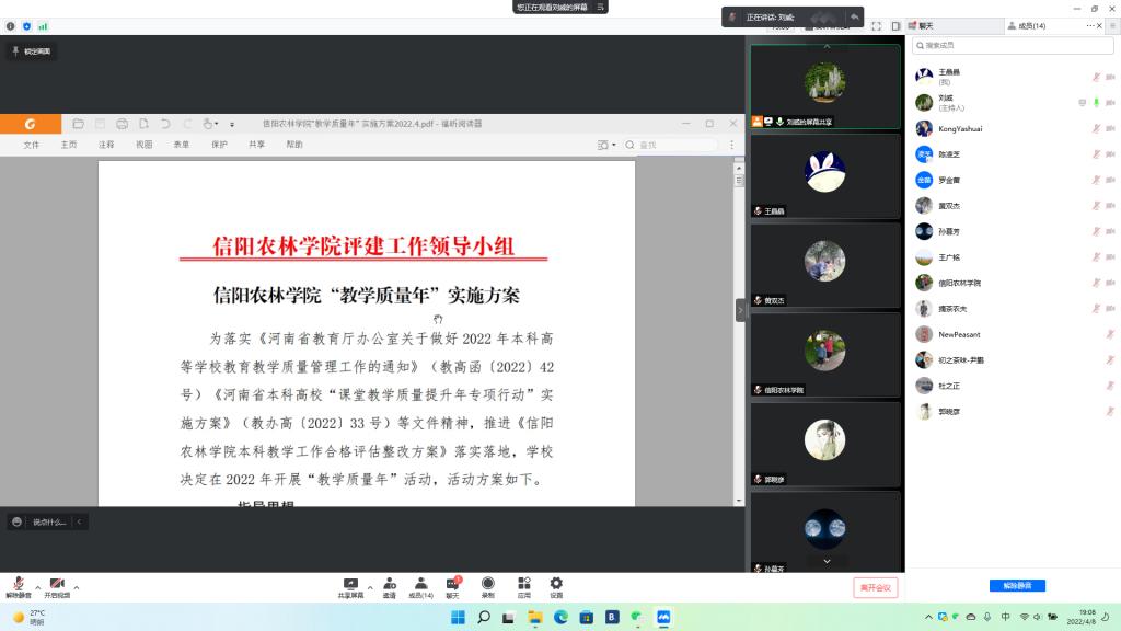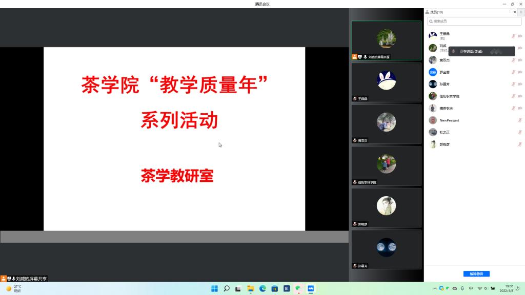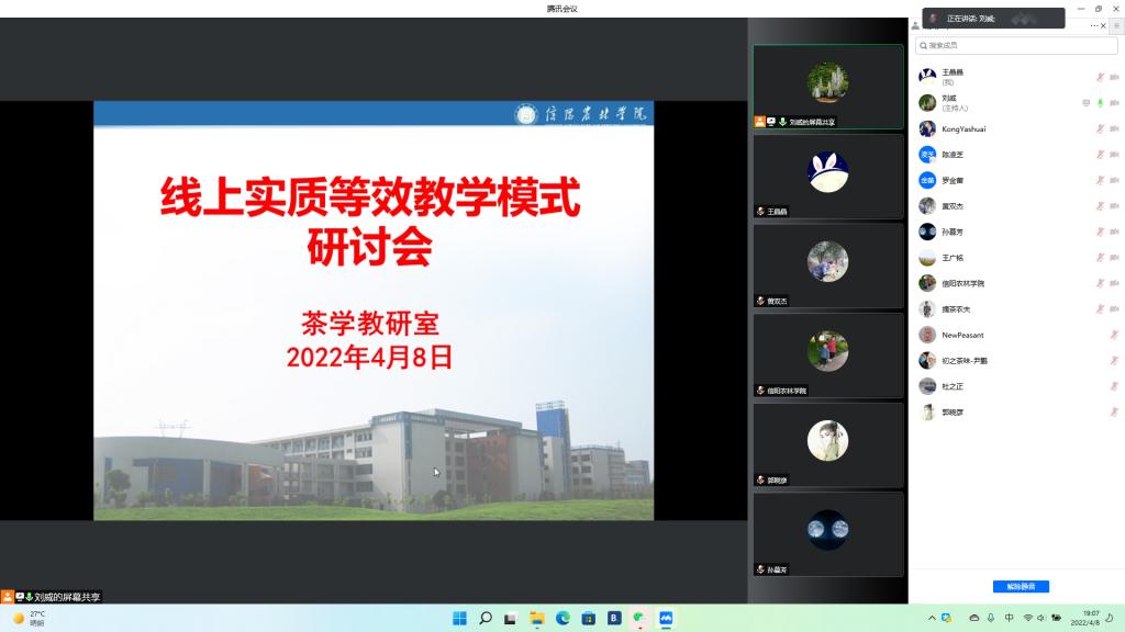 4月8日晚,为引导茶学院教师积极开展实质等效的线上课堂教学活动,强化教学主要环节质量管理,切实提高线上教学效果,并贯彻beat365在线平台官网印发的《beat365在线平台官网“教学质量年”活动实施方案》,茶学教研室举办线上实质等效教学模式研讨会,副院长孙慕芳、副院长陈义、茶学教研室主任刘威以及教研室的各位教师参加了研讨。