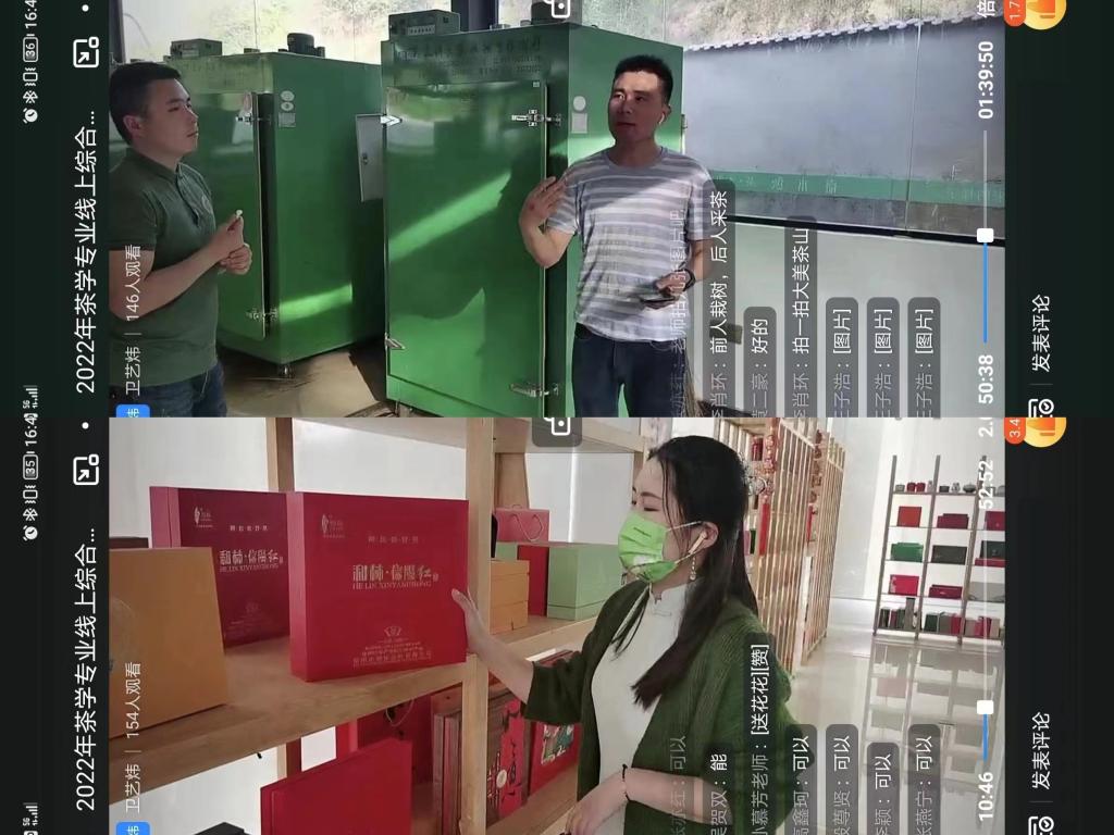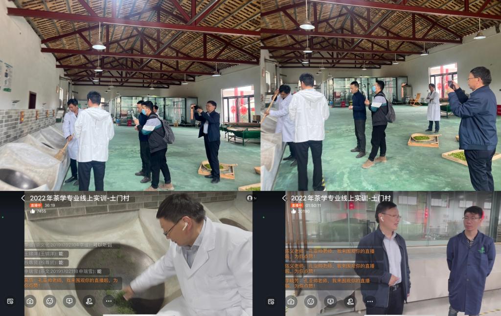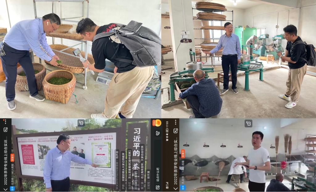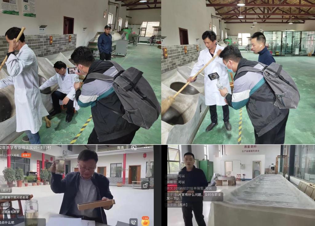 4月20日,郭桂义院长再次带领《制茶学》课程组陈义副院长、王子浩和孔亚帅等专业老师到信阳毛尖核心产区开展线上授课。在信阳周肖同茗茶业有限公司和信阳云珍茶叶有限公司(遇鉴茶业),各位专业教师就信阳毛尖茶加工场所建设、食品生产许可(SC)认证、信阳毛尖茶手工炒制、信阳红茶和信阳白茶各加工工序进行讲解,并适时答复同学们在钉钉群中提出的各个问题。在直播的同时,信阳周肖同茗茶业有限公司的信阳市非遗传承人(信阳毛尖茶制作技艺)肖兴亮为师生演示了信阳毛尖茶的制作技艺;遇鉴茶业的技术负责人就红茶发酵要求进行了详细而又专业的解读。