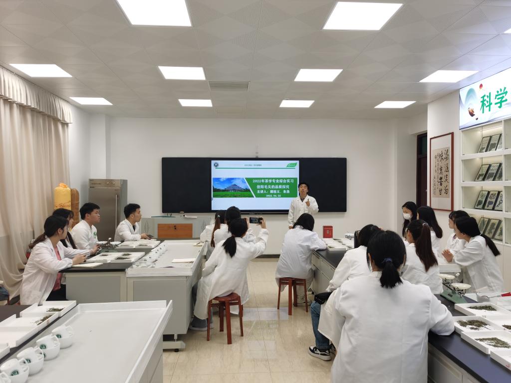 4月21日,茶学专业综合实训转入校内线下(茶学实验教学中心1C205)进行,《茶叶审评与检验》主讲教师郭桂义教授和朱尧老师按照《GB/T 23776-2018 茶叶感官审评方法》对信阳市不同县区、茶树品种以及新茶和陈茶进行感官审评和品质鉴定,让同学们对信阳毛尖品质风味形成的进行深入地了解。此次感官审评的信阳毛尖茶样品包括2022新产车云山村、土门村(周肖同茗)、谭家河乡商城县毛尖和2021年天云山村、浉河港乡、商城县信阳毛尖、光山县白化茶等,以上代表性茶叶样品均由负责老师精心搜集和整理。线下实训期间,茶学教研室主任刘威和茶学实验教学中心主任尹鹏对实训情况进行了督导和检查。