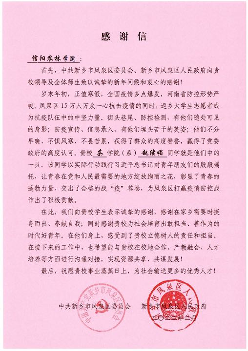 在志愿服务方面,班级同学利用自己寒暑假的空暇时间投身于当地的防疫、抗洪工作中,每学期班级参与同学累计达到16人次,达到班级总人数的50%以上,其中赵续媚同学收到当地区政府感谢信一封。众多同学通过自己的无私奉献既获得了当地政府部门的认可,又为班级增添了更多的荣誉。(撰稿人:朱尧、尹鹏 审稿人:孙慕芳、朱建梅)