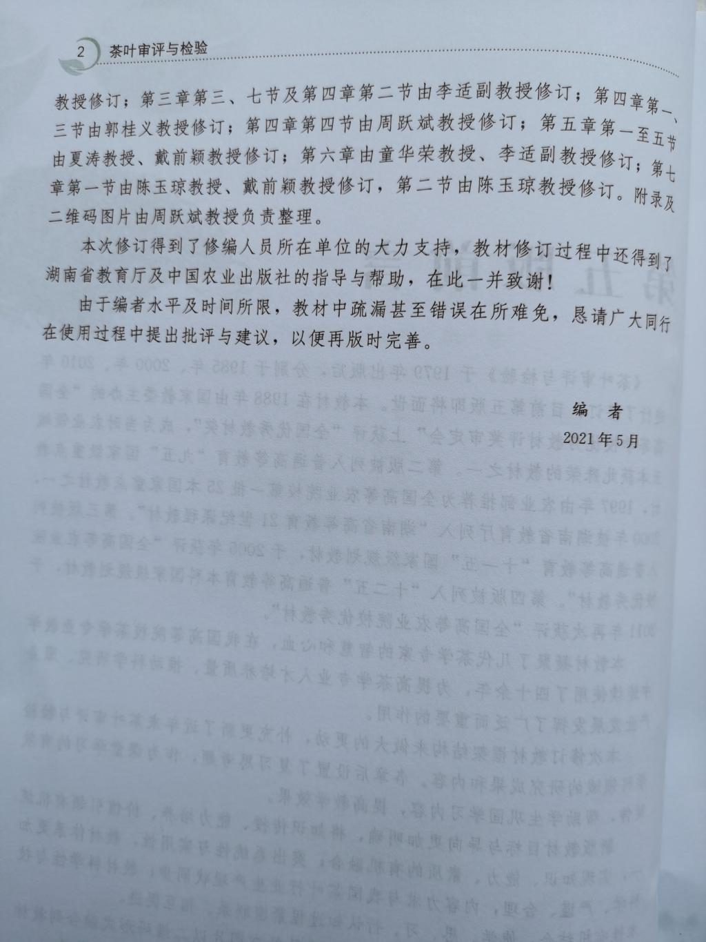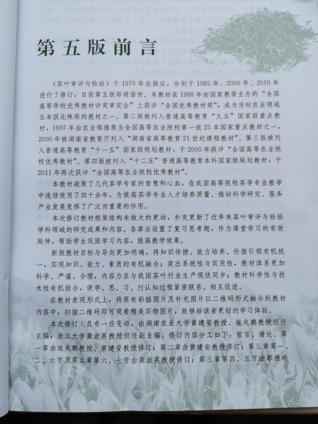 《茶叶审评与检验(第五版)》教材目标与导向更加明确,将知识传授、能力培养、价值引领有机统一,实现知识、能力、素质的有机融合;突出系统性与实用性,教材体系更加科学、严谨、合理,内容力求与我国茶叶行业生产现状同步;教材科学性与技术性有机结合,使学、思、习、行认知过程紧密联系、相互促进。(撰稿人:张永瑞 审核人:郭桂义)