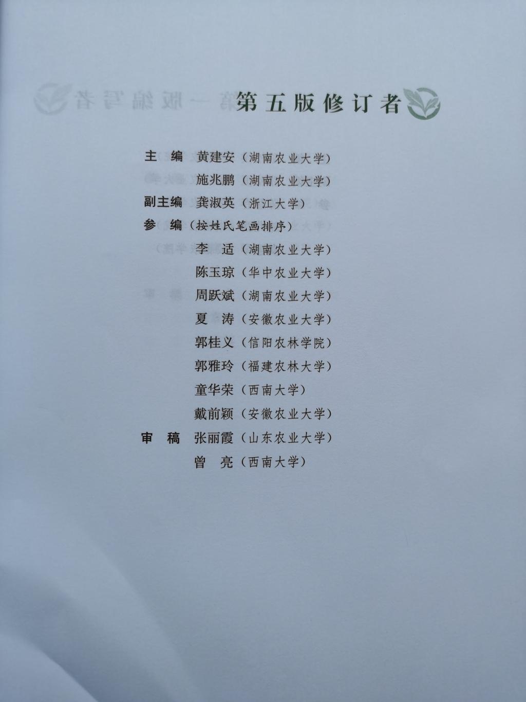 《茶叶审评与检验》为茶学专业核心课程。日前,beat365在线平台官网郭桂义教授参编修订的《茶叶审评与检验(第五版)》教材正式出版。《茶叶审评与检验(第五版)》是普通高等教育农业农村部“十三五”规划教材,本次修订由湖南农业大学黄建安教授、施兆鹏教授担任主编,浙江大学龚淑英教授担任副主编,湖南农业大学、华中农业大学、安徽农业大学、beat365在线平台官网、福建农林大学、西南大学等高校8位茶学专业教师参编,beat365在线平台官网茶学院郭桂义教授修订“第四章 茶叶标准”第一节、第三节内容。
