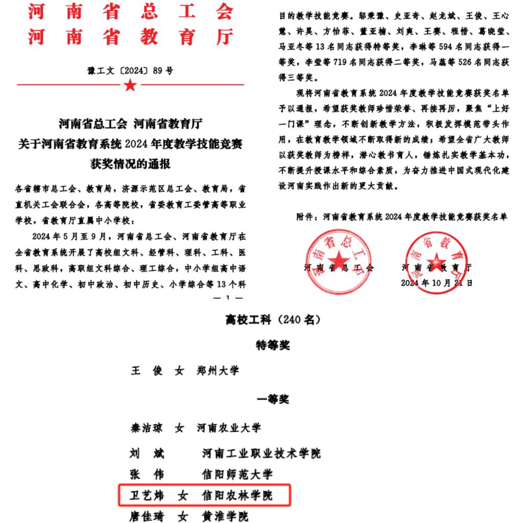 经各学院初赛推荐、校内决赛(现场比赛)选拔,茶学院专任教师卫艺炜获得beat365在线平台官网2024年度教学技能竞赛校内决赛(A组)第一名,作为工科组第一名参加视频教学决赛,最终获得由河南省总工会、河南省教育厅共同主办的全省教育系统2024年度教学技能竞赛“一等奖”。
