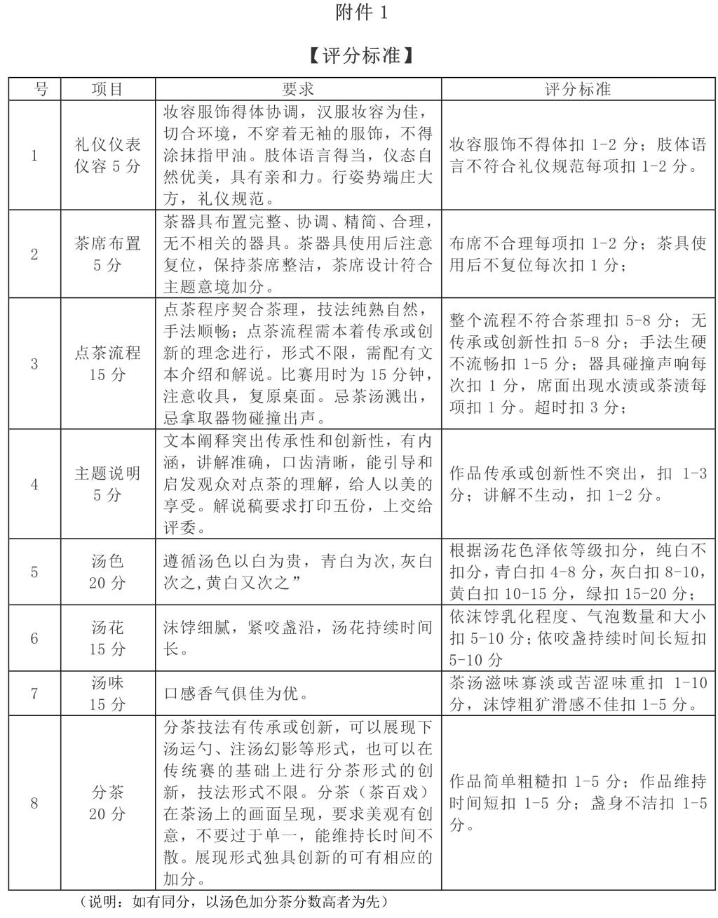 比赛时间为15分钟,备具、收具时间各3分钟。评分标准详见附件1