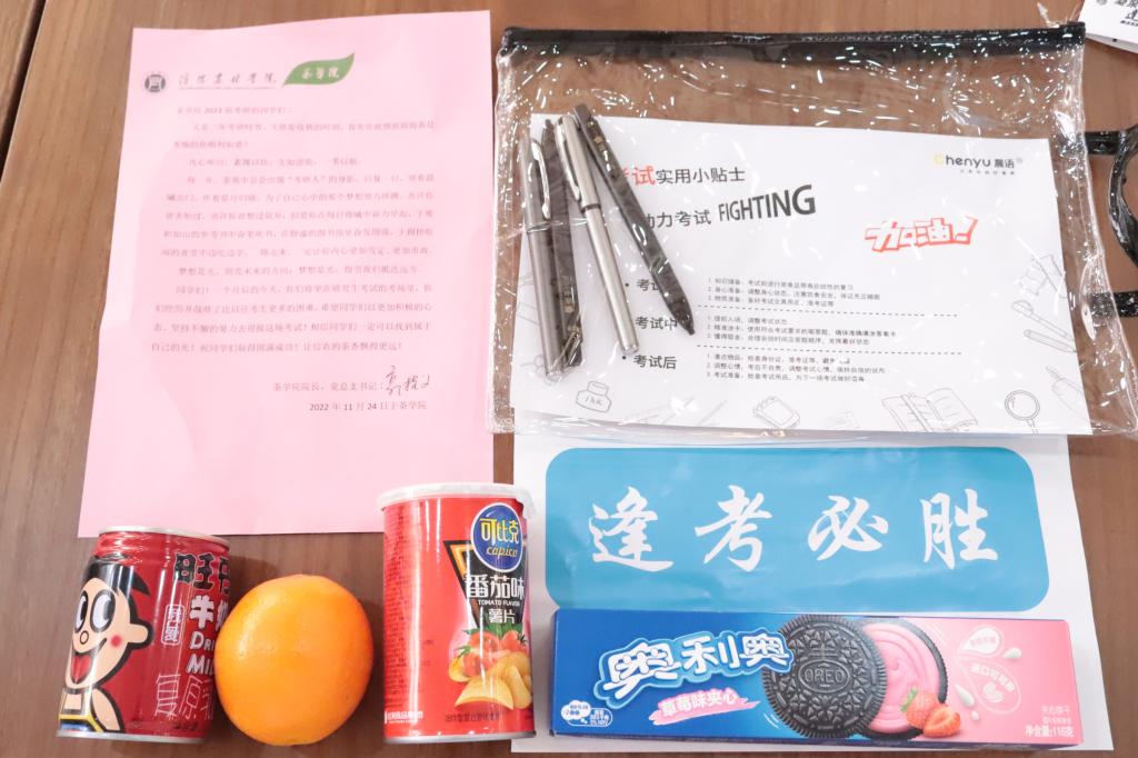 学院特为同学们准备了“考研福袋”,福袋中里面配有考试必备文具,补充能量的水果、食品以及由茶学院院长、党总支书记郭桂义手写签名的祝福语,每一句温暖的话语、每一段真诚的文字,都彰显出对同学们的真诚祝福,给予了考研的学生无限的能量,使他们倍感温暖。