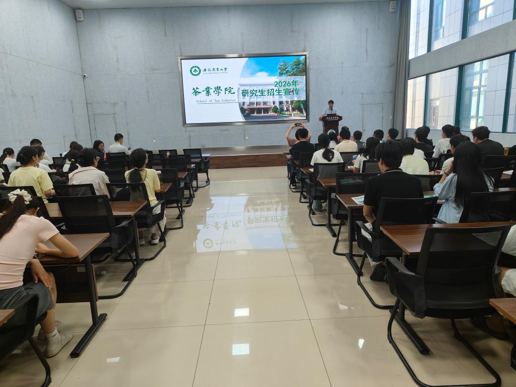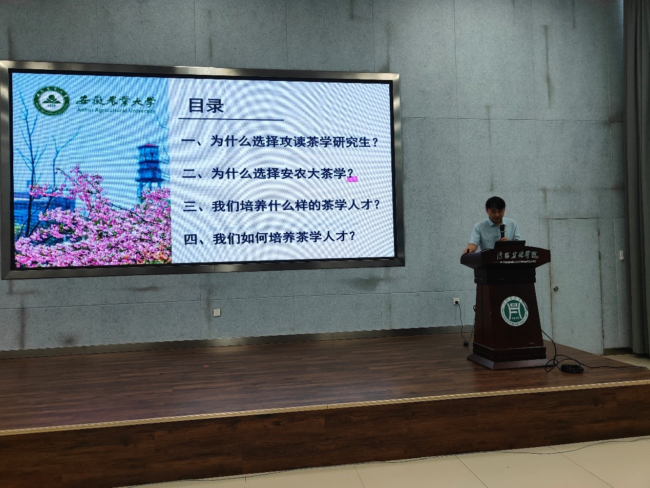7月3日,安徽农业大学茶业学院副院长宋传奎教授和副院长张照亮教授一行于学术交流中心会议室,面向我院大三学子进行研究生招生宣讲,为有志深耕茶学的青年铺就清晰学术路径,报告会由茶学院党委书记王鹏主持。