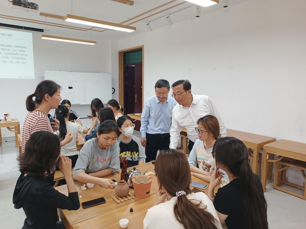 学校期中教学检查之际,426日上午,副校长李益民走进茶学院科技楼1C203茶艺教学实验室督导实验教学。茶艺与茶文化23班学生正在进行《茶艺》课程的实验项目“少数民族茶艺—白族三道茶”项目,副校长李益民向师生详细了解“白族三道茶”的冲泡步骤和操作方法,并希望同学们结合自身的学习和生活深刻理解“白族三道茶”的寓意,即“一苦,二甜,三回味”。督导期间,副校长李益民调研了茶学教育教学改革项目申报、专业建设、实习实训场所等教学工作并给予指导。(撰稿/摄影 尹鹏)
